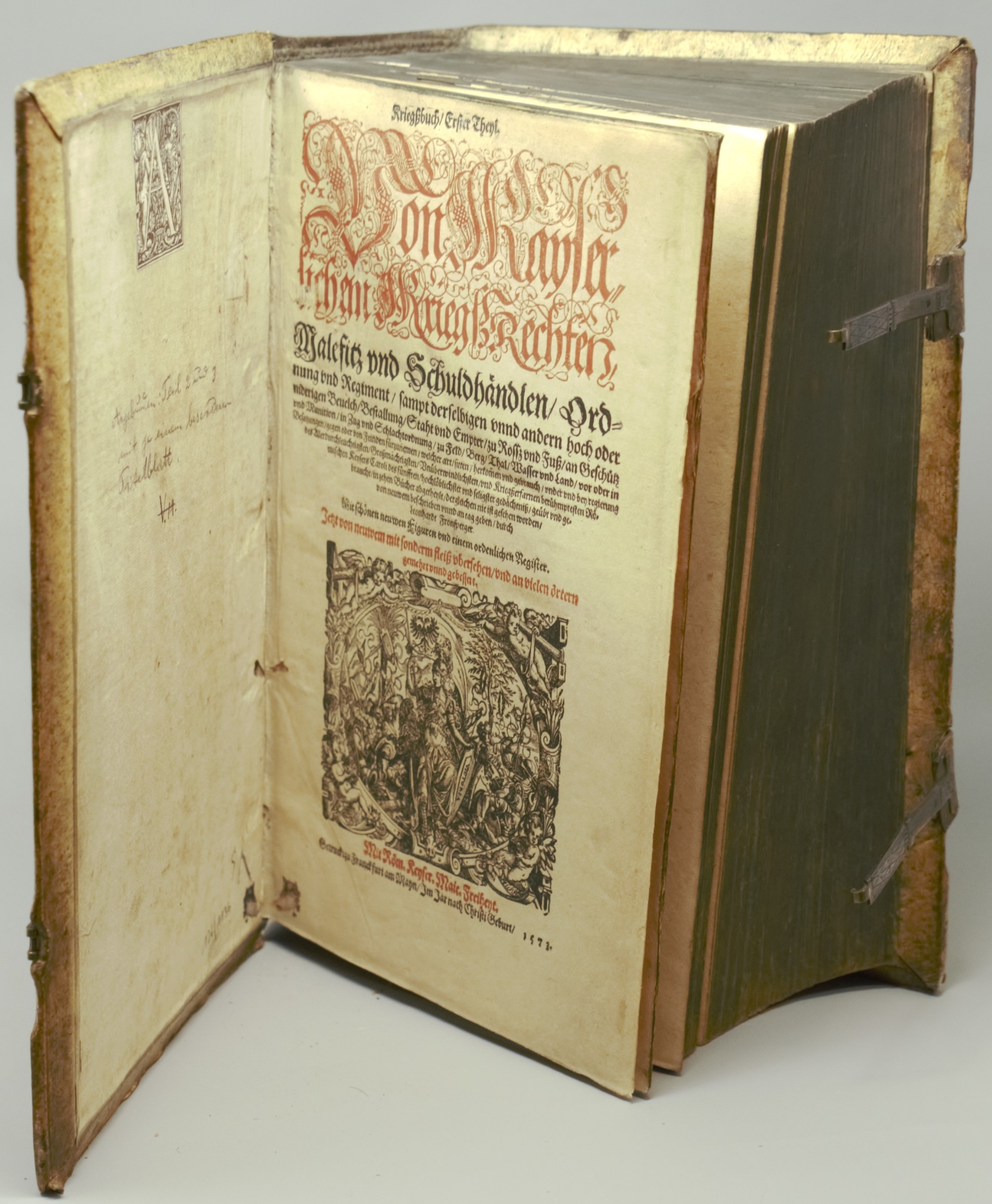 VD16 F 3121-3123. Vgl. STC 324.  – Frühe Ausgabe aus der Offizin von Sigmund Feyerabend in Frankfurt. Leonhard Fronsperger, auch Fronsberger, (1520-1575) war ein deutscher Militärschriftsteller und -theoretiker. Er tragt schon in jungen Jahren den Kriegsdienst ein und kämpfte für den habsburgischen Kaiser. Im Jahr 1548 bekam er das Ulmer Bürgerrecht und wurde im ersten österreichischen Türkenkrieg zum Feldgerichtsschultheißen ernannt. Seine Werke zum Kriegsrecht gelten als Wegweisend und als Fundament der Militärtheorie. – Vorderes Innengelenk geöffnet. Titel und ersten vier Blätter mit kleinen Wurmgängen. Leicht braun- und fingerfleckig sowie mit kleinen wenigen Randläsuren.