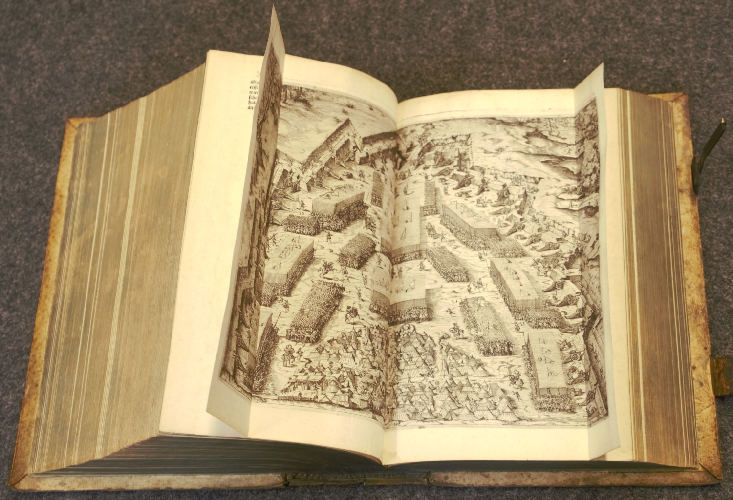 Fronsperger, Leonhardt. Von Kayserlichem Kriegßrechten, Malefitz und Schuldthändlen, Ordnung und Regiment ... [und:] Ander Theyl. Von Wagenburgk umb die Feldleger ... [und:] Dritter Theyl. Von Schantzen unnd Befestunngen. Teil I-III in 1 Band. Mit 4 Holzschnitt-Vignette auf dem Titel, 30 Kupfertafeln und zahlreichen Text-Holzschnitten. 1. und 2. Titel in Schwarz und Rot. 32 x 21 cm. Blindgeprägtes Schweinsleder d. Z. (berieben, bestoßen und mit kleinen Einrissen an den Kapitalen) über abgefasste Holzdeckel, 5 Bünde und 2 Messingschließen. Frankfurt, M. Lechler für H. Feyrabend, 1573.