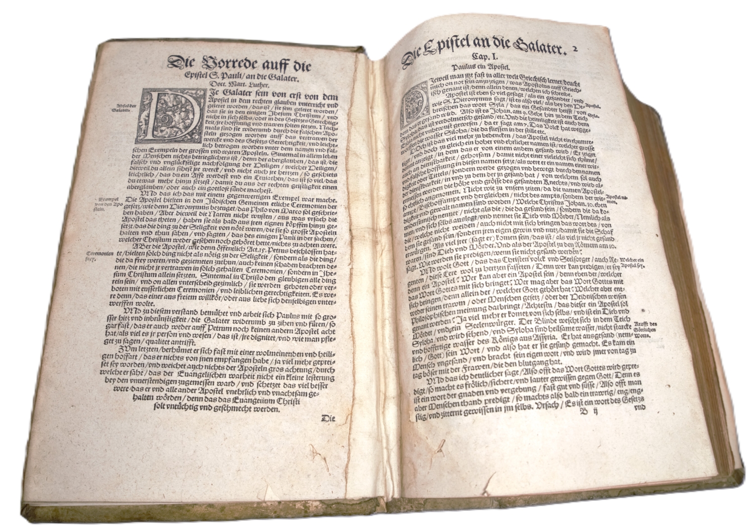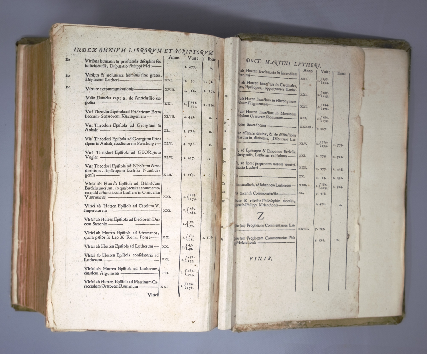 Benzing 1. Vgl. VD16 L 3343. – Frühe Ausgabe aus der Offizin von Hans Lufft des zwöflten und letzten Teil der Lutherischen Gesamtausgabe. – Papierbedingt gebräunt, leicht braunfleckig, vereinzelt mit kleinen Wurmlöchern und -gängen und teils mit Randläsuren. Der einst prachtvolle Einband mit großen, teils abgeriebenen Versalien, einst in Goldprägung (nunmehr meist oxidiert): "M [...] H M, HENNINCK HALBERSTAD, G V D S N ILSE HOLSTEIN 1597". Möglicherweise handelt es sich um ein Hochzeitsgeschenk für eine Halberstädter Adelsfamilie, der Name Henninck ist im Halberstädtischen sehr häufig.