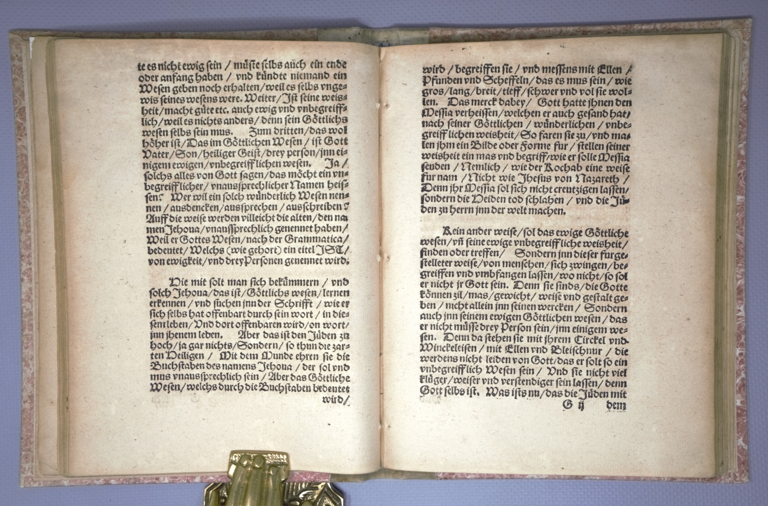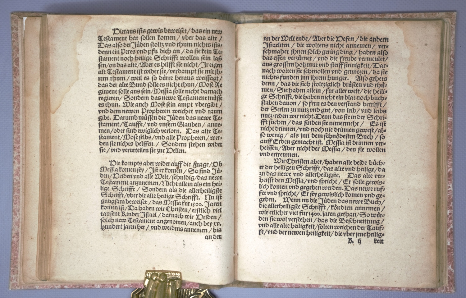 VD16 L 7061-7064. Benzing 3436-3439. – Einer von vier kollationsgleichen Drucken, die im Jahr des Erstdrucks bei Georg Rhau in Wittenberg erschienen. Die zweite von drei erschienenen wirkungsmächtigen Spätschriften Luthers, die von einer stark antijudaistischen Theologie und judenfeindlichen Stereotypen geprägt sind und als sogenannte Kampfschriften gegen das Judentum vielfach ideologisch eingenommen wurden. Schem Hamphoras bildet eine "Zusammenstellung der in 2. Mos. 14, 19-21 enthaltenen 216 Buchstaben. Ihnen wurde, wenn man sie richtig hersage, wunderbare Kraft beigelegt. Bei den Juden war die Mär verbreitet, dass Jesus eben mittels dieses Schem seine Wunder vollbracht habe, bis er zur Strafe gehängt worden sei" (Köstlin-Kawerau II, 590). – Erste zwei Blatt und das Schlussblatt mit kleiner angestückter Ecke, Titel oben mit schmalem Feuchtigkeitsrand, obere Ecke nahezu durchgehend mit zumeist verblasstem Wasserrand, Blatt Ni und Nii dort mit kleinerem Einriss.