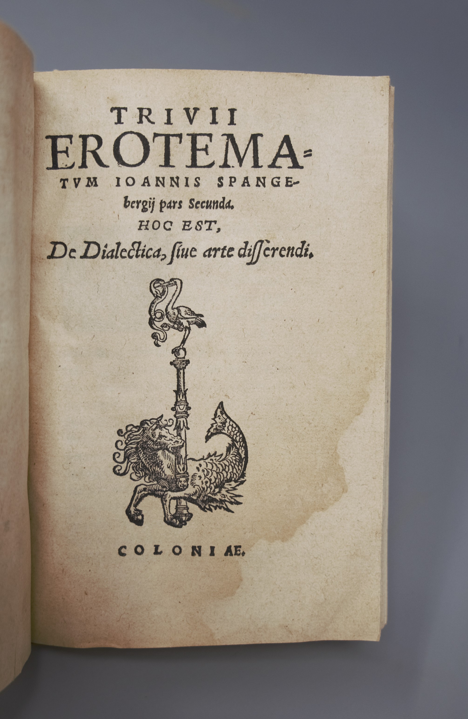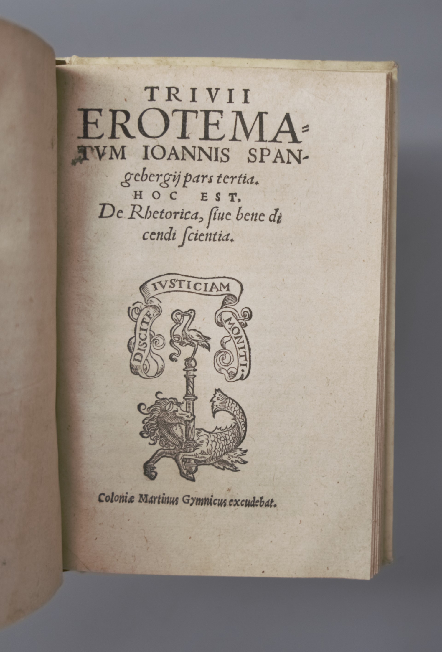 Spangenberg, Johannes. Trivii erotematum pars prima [bis: tertia]. 3 Teile in 1 Band. A-I8, A-H8 (H8 vacat), A-E8. Mit ganzseitigem Holzschnitt und 3 Holzschnitt-Druckermarken. 15 x 9 cm. Modernes Pergament mit goldgeprägtem RTitel. Köln, Witwe Martin Gymnich, 1551.