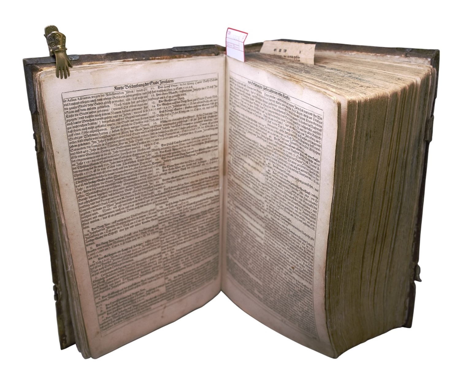 Reinitzer 169. – Die erste Ausgabe der grossen Weimarer Kurfürstenbibel. Mit den Porträts Luthers (1483-1546; von Visscher nach Stuernhelt) und von elf Kurfürsten und Herzögen, die Ansichten u. a. mit Darstellung des Ketzerbaums und der Arche Noah. – Es fehlt das letzte Blatt und die Kupfertafel der Augsburger Konfession. Die meisten Blätter mit hinterlegten Randläsuren, teils mit Ausrissen (ohne Textverlust, teils etwas Darstellungsverlust). Wenige Blatt an kleinen Stellen durch die Resturierung miteinander verklebt. Die mehrfach gefaltete Karte verso mit Japan hinterlegt und kleinen Ausrissen. Vorsatz mit mehreren hs. Einträgen d. Z. Innen etwas fleckig und gebräunt.
