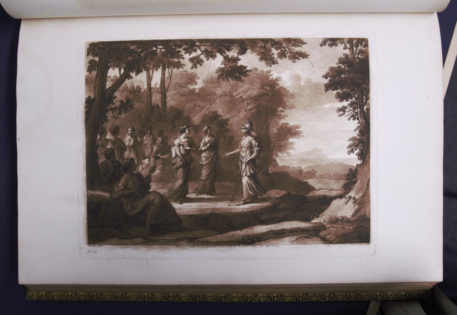 Earlom, Richard. Liber veritatis; or a collection of prints, after the original designs of Claude Lorrain; in the collection of his Grace the Duke of Devonshire. Executed by Richard Earlom, in the manner and taste of the drawings. 3 Bde. Mit Mit 3 Porträttafeln (davon 2 in Schabkunst) und 300 Aquatintatafeln in Sepiadruck. 41 x 25 cm. Güne Chagrinlederbände d. Z. )teils berieben und beschabt) mit mehrfacher vergold. Deckel- und Innenkantenfileten, reicher RVergoldung und Goldschnitt. London, Boydell, (1777-1819).