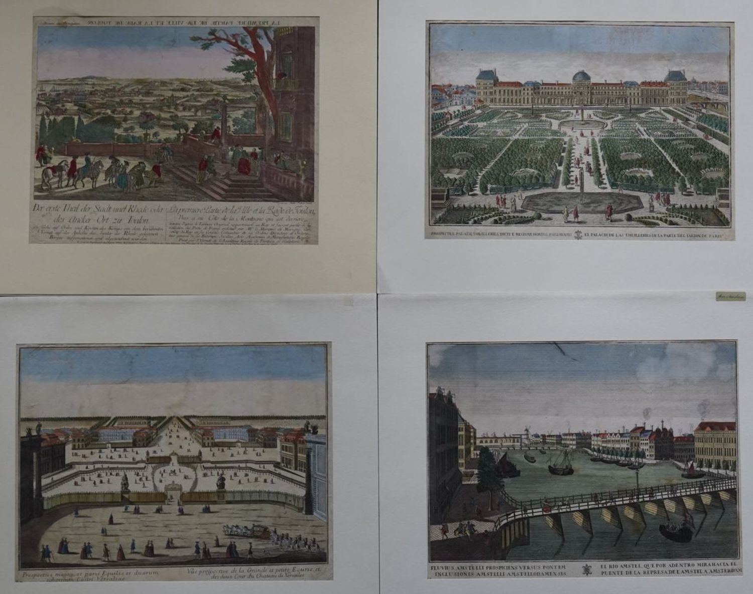 Vorhanden sind zum Beispiel Ansichten von Konstantinopel, Rom, Athen, Paris, London, Marseille, Middelburg, Oxford, Preslau, etc. – Teilweise knapp beschnitten, etwas braun- und fingerfleckig, wenige feuchtrandig sowie vereinzelt knickspurig. Insgesamt alle im kräftigen Kolorit und sehr dekorativ.