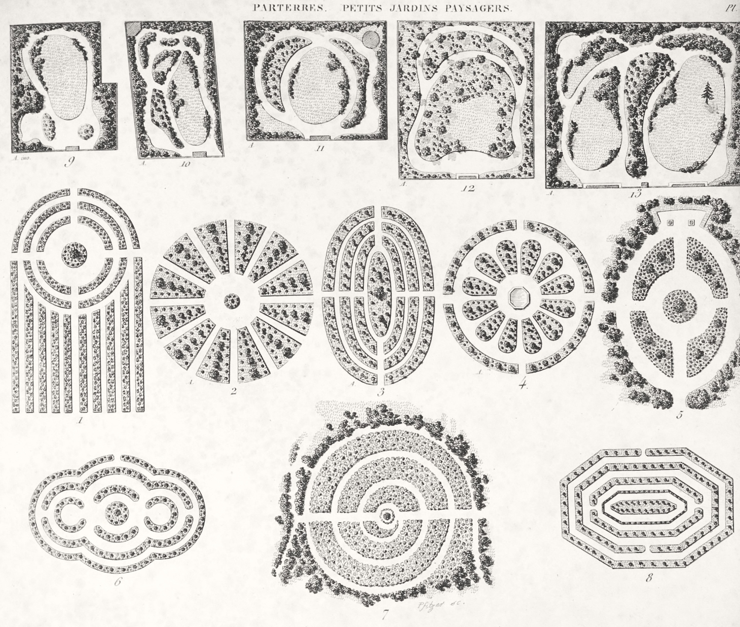 (Schoubin, J.). Traité de la composition et de l'ornament des jardins. Cinquième édition. XI, 225 S. Mit 161 Kupfertafeln. 17 x 22 cm. Etwas späterer Halbleinenband (berieben) mit RTitel. Paris, Audot, 1839.