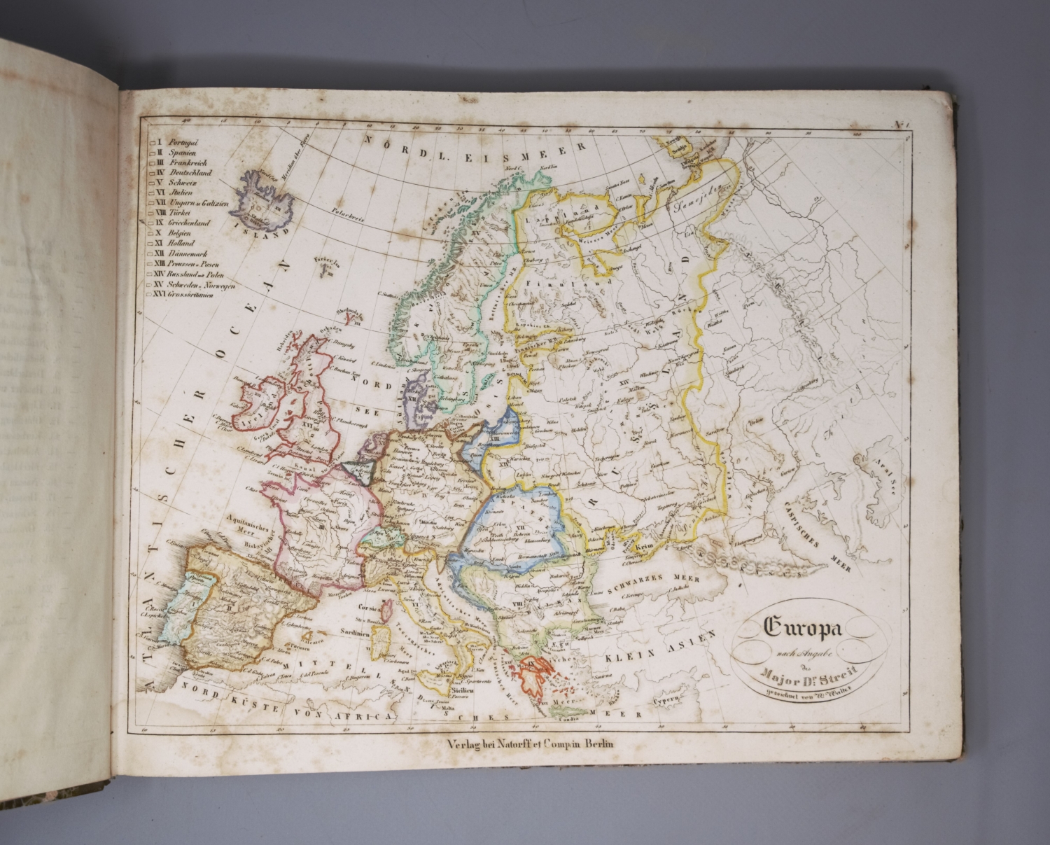 Streit, F. W. Atlas von Europa. 1 Bl. (Verzeichnis). Mit gestochenem Titel und 82 (78 grenzkoloriert) gestochenen Karten. 26 x 32,5 cm. Halbleder d. Z. (berieben und bestoßen, Bezugspapier mit teils größeren Schabspuren). Berlin, W. Natorff, 1837.