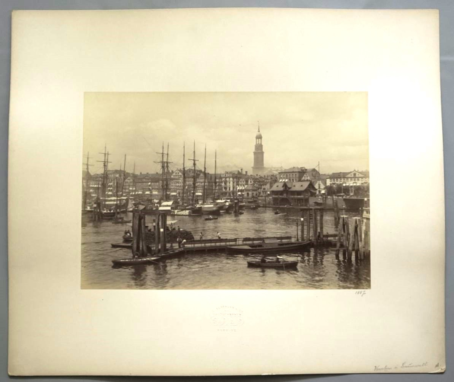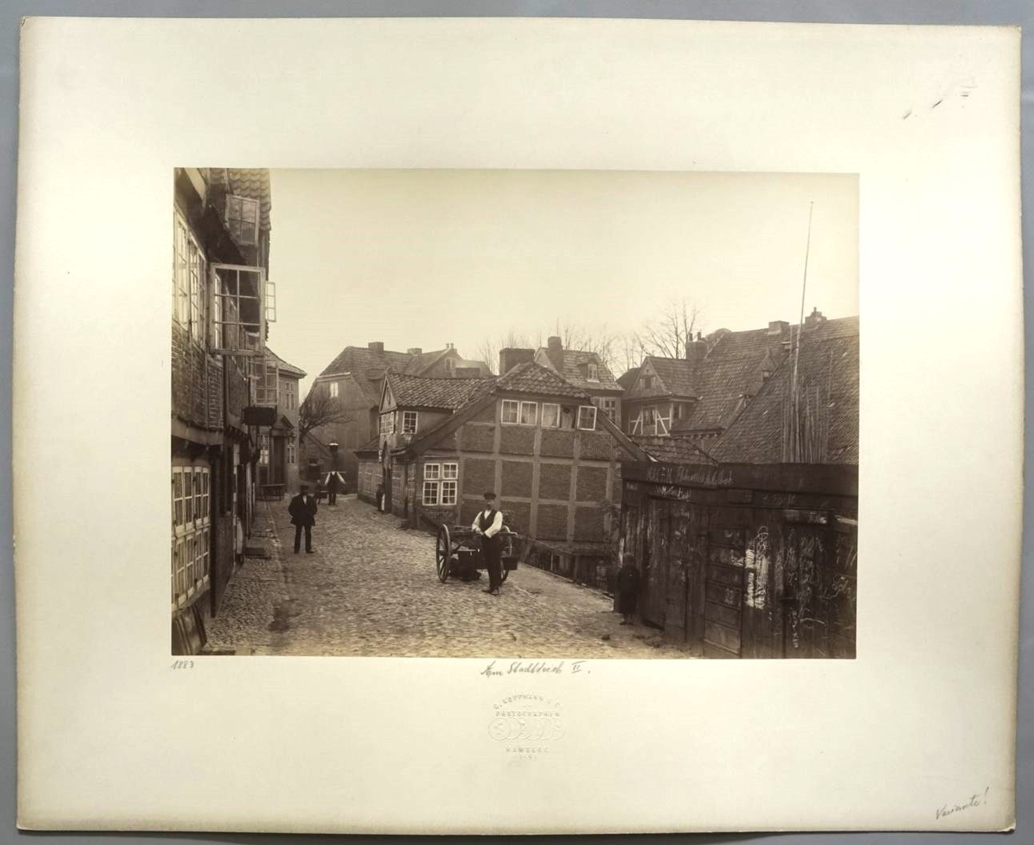 Heidtmann 17389. – Die Tafeln zeigen zahlreiche Straßen und Plätze Hamburgs, wie zum Beispiel: "Hohebrücke", "Brook von Osten aus gesehen", "Kleines Fleth vom Sandthorquai aus gesehen", "Englische Kirche am Johannisbollwerk II", "Mührenfleth östlich vom Wasserbaum bei Spenshörn", "Am Stadtdeich I.", "Am Stadtdeich II.", "Ansicht der Rathswaage", "Kehrwieder von der Hellenenbrücke aus gesehen", "Niederbaumbrücke", "Rathhausmarkt", "Kehrwieder No. 74" etc. – Teils leicht gewellt und Karton mit Einrissen, Fehlstellen und teils kleinen Gebrauchsspuren. Fotografien vereinzelt leicht verblasst, sonst gut erhalten.