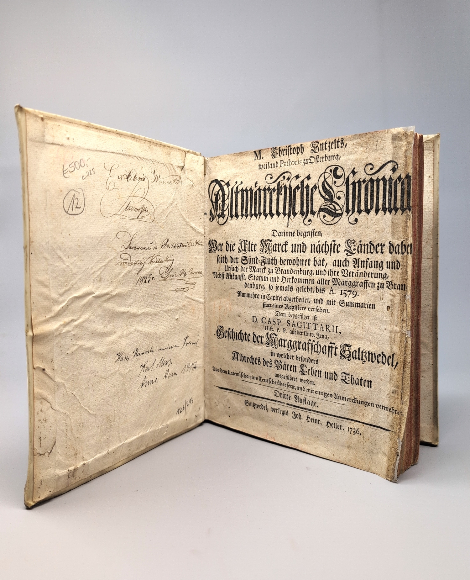 VD18 14448882. – Dritte Ausgabe dieser frühen, zuerst 1579 erschienenen Regionalgeschichte der Altmark durch den Historiker und evangelischen Theologen Christoph Entzelt (1517-1583), die sich allerdings vornehmlich auf genealogische und heraldische Details konzentriert. "Neben seiner treu verwalteten Seelsorge beschäftigte er sich mit der Geschichte der Altmark Brandenburg. Als Resultat dieser Studien veröffentlichte er 1579 zu Magdeburg seine von Regenten-Genealogien durchwebte 'Cronica der alten Mark', die später der Feldprediger Chr. W. Bayer mit Anmerkungen bereicherte und 1732 zu Salzwedel von neuem herausgab". Im Anhang die mit eigenem Titel ausgestattete "Geschichte der Marggraffschafft Saltzwedel" von Caspar Sagittarius (1643-1694). – Titel im Seitenrand gebräunt und etwas lädiert, dort hinterlegt, Innenspiegel mit mehreren Besitzeinträgen.