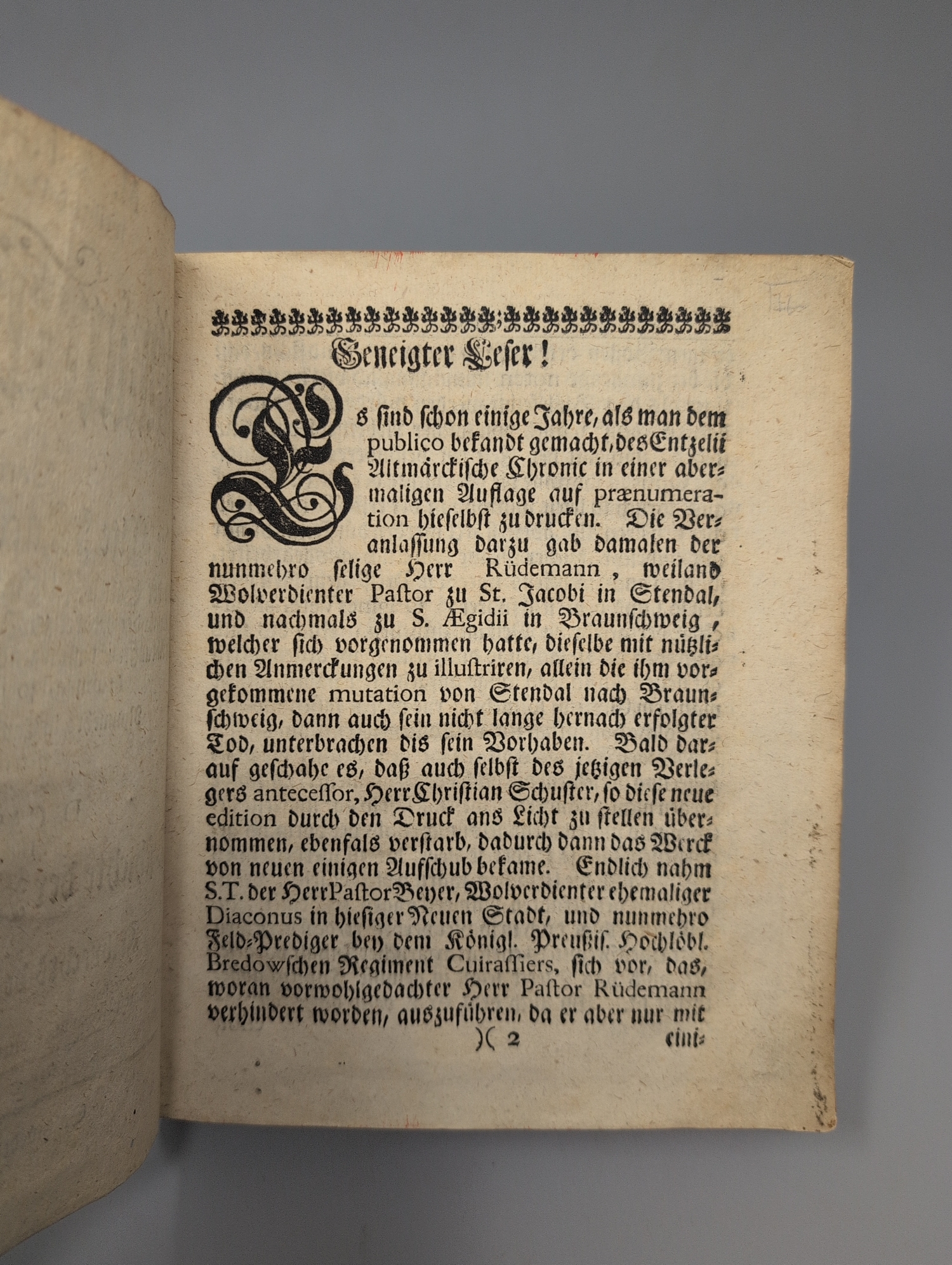 Entzelt, Christoph. Altmärckische Chronica, darinne begriffen, wer die Alte Marck und nächste Länder dabey seith der Sünd-Fluth bewohnet hat, auch Anfang und Ursach der Marck zu Brandenburg, und ihre Veränderung, nebst Ankunfft, Stamm und Herkommen aller Marggraffen zu Brandenburg, so jemals gelebt, bis A. 1579. Aus dem Lateinischen ins Teutsche übersetzt, und mit einigen Anmerckungen vermehrete dritte Auflage. 8 Bl., 196 S. 20 x 16 cm. Pergament d. Z. (etwas fleckig und berieben) mit goldgeprägtem RTitel. Salzwedel, Johann Heinrich Heller, 1736.