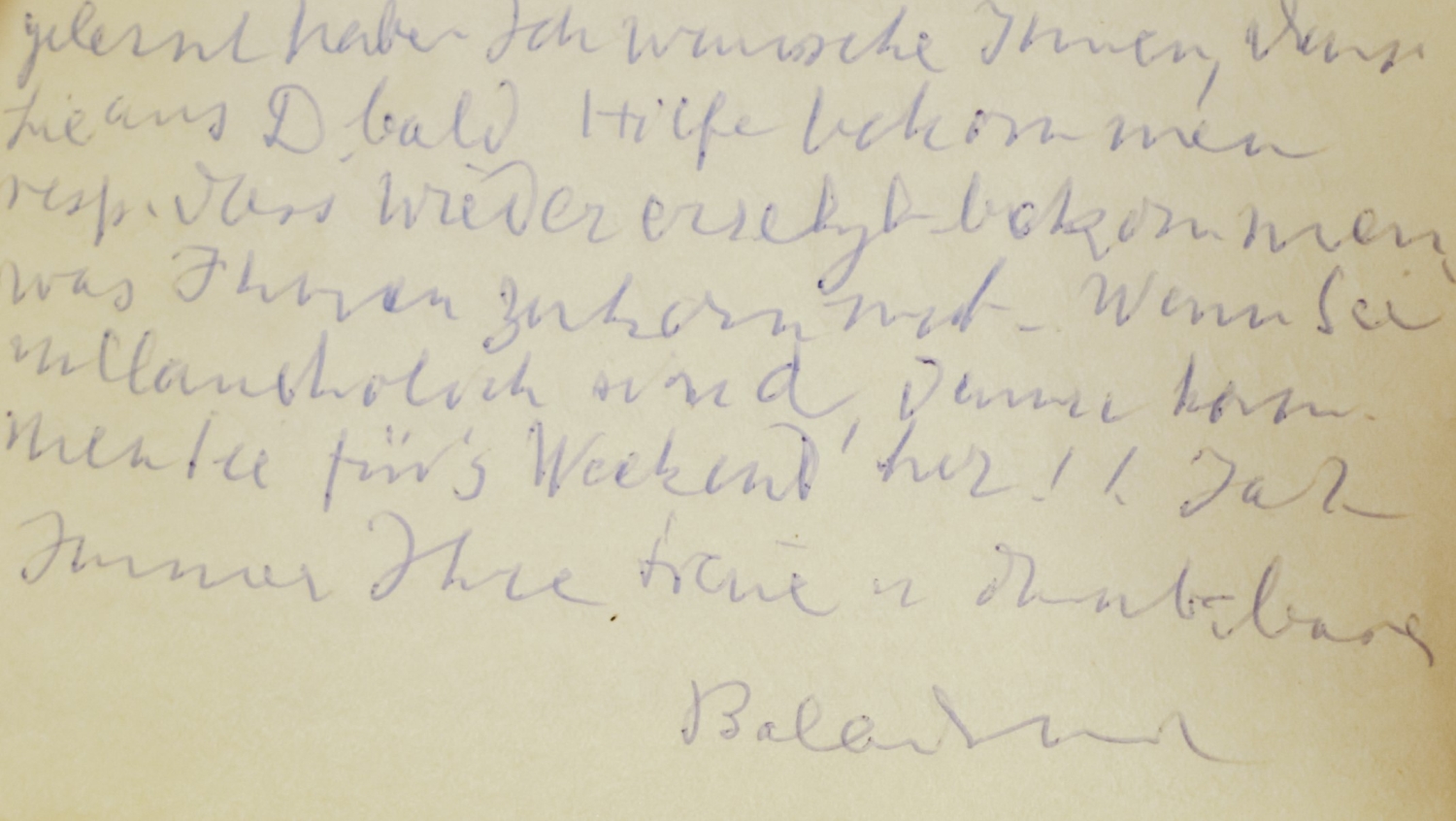 An die Ärztin, Psychologin, Chirologin, Sexualwissenschaftlerin und Schriftstellerin Charlotte Wolff. Inhaltsreiche Briefe über Familie und Freunde sowie über eigenes Dasein und Empfinden. Sie schwärmt für R. M. Rilke, ihren einstigen Geliebten, den Patenonkel und Namensgeber ihres Sohnes Balthus: "... ich schlief heute nacht bis 21/2 und wachte, indem ich bis in den Morgen hinein im dicken Gedichtband von R. las; ich komme nicht von ihm los und weinend bin ich gegen 1/2 6 eingeschlafen. Ach Lotte, der hat mich nicht geliebt und ich habe sehr viel Schuld daran und ich gräme und gräme mich zu Tode ... Rilke wollte 'einsam' sein - aber er lockte in seiner Einsamkeit, er spann unsichtbare Fäden, die Netze wurden, und die, welche hineintorkelten, waren für seine 'Versuche' Objekte, die ihm die Einsamkeit beschäftigen halfen. Er dichtete dann diese unsichtbaren Wesen an - die er hold und schön sich ausmalte und seine Neugier entfachten - wunderbare Gedichte - und immer seine Art erklärten ...". Öfter kommt sie auf ihren Sohn Pierre Klossowski und vor allem auf ihren Enkel Matthieu zu sprechen. Ferner über verschiedene Verwandte und Freunde. Und Rilke taucht immer wieder in den Briefen auf.