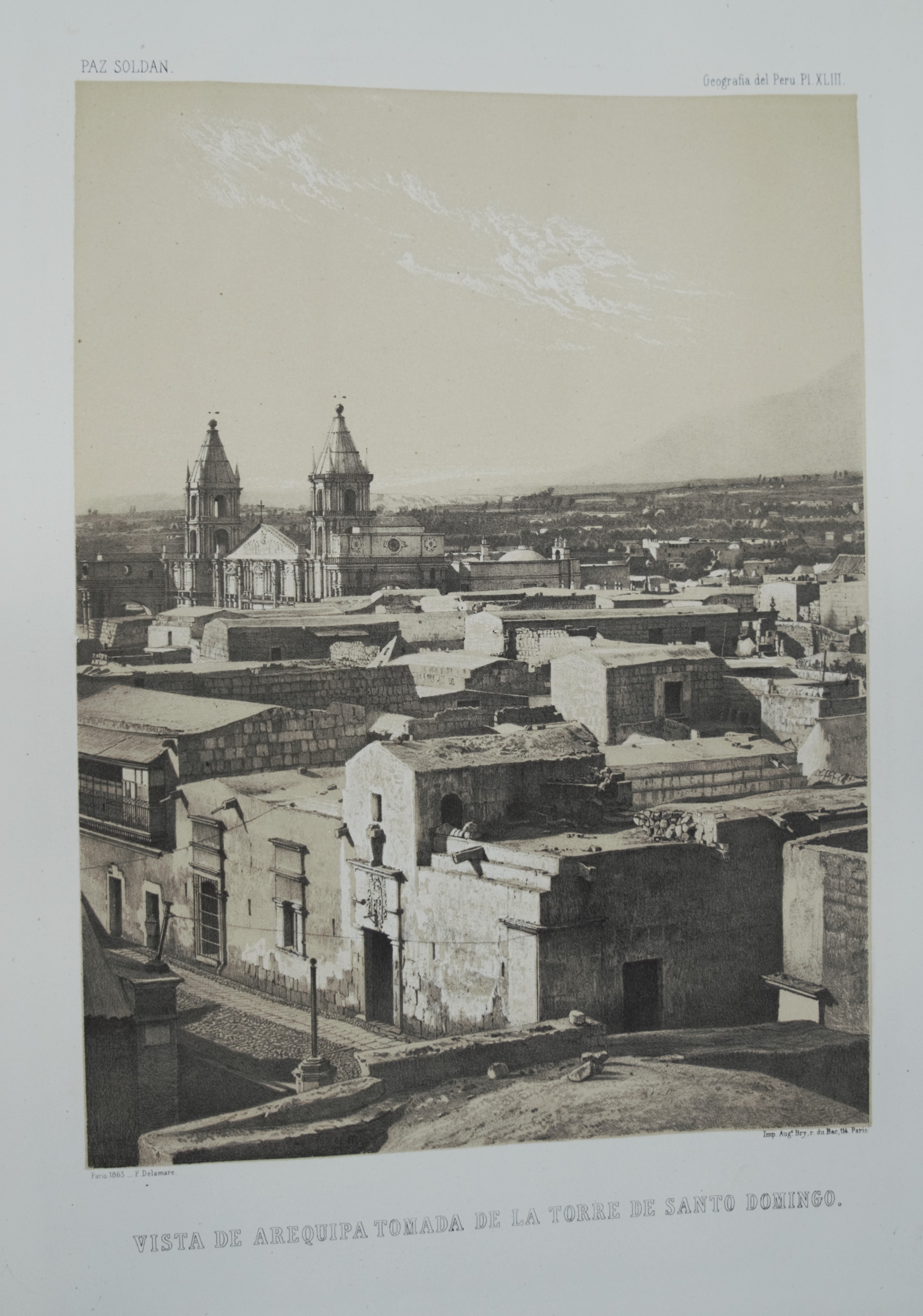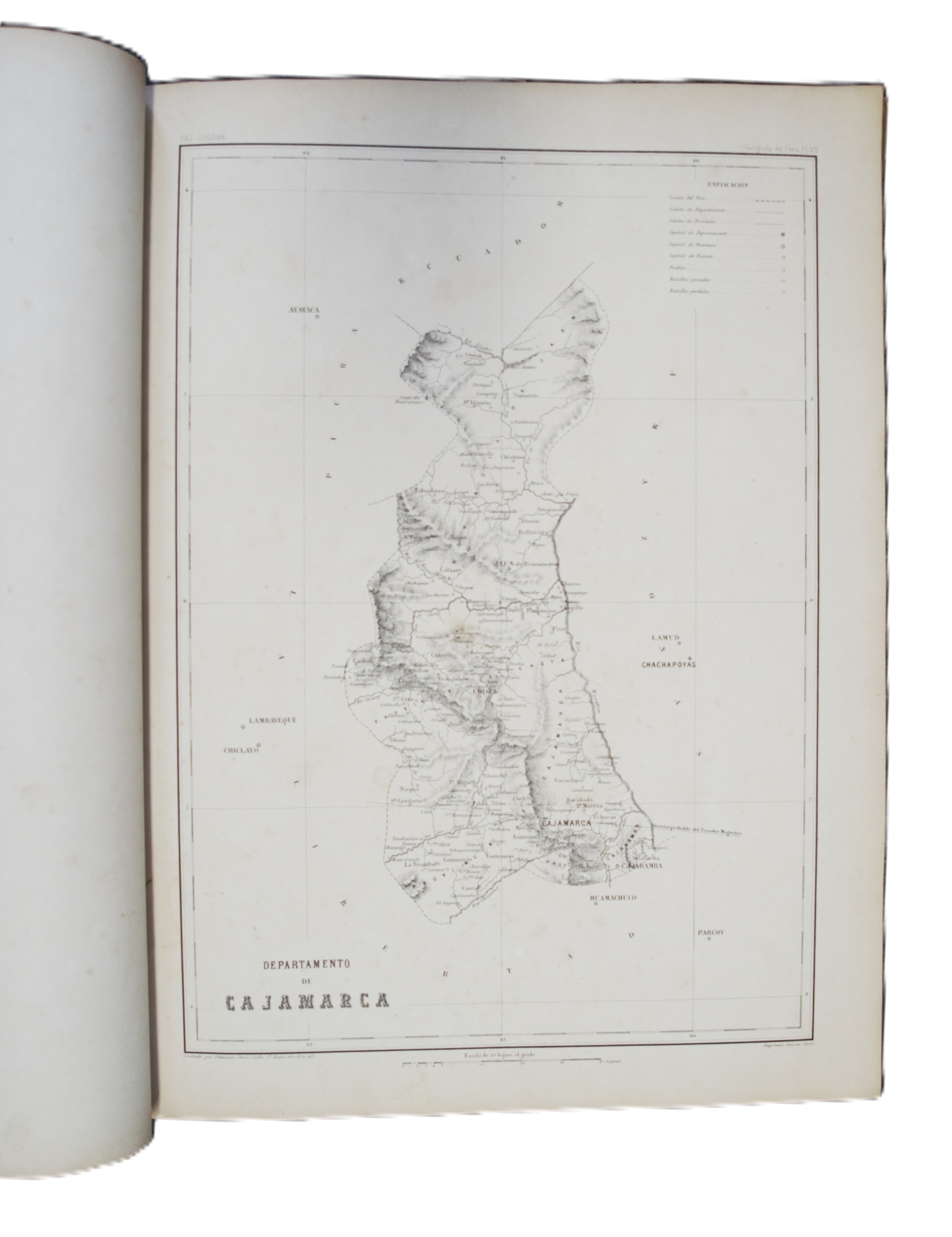 Phillips I, 2769 (73 Tafeln). Palau VI, 54 (68 Tafeln). Sabin I, 59325 (67 Tafeln). – Ein Atlas über Peru von dem peruanischen Historiker und Geograf Mariano Felipe Paz Soldan (1821-1886). Die zahlreichen Tafeln zeigen Ansichten des Landes, Landkarten, Stadtpläne und Alltagsszenen. – Zusätzlich Tafel XXIXbis vorhanden, diese nicht bei Phillips angegeben. Einige der Titel auf den Tafeln mit leichten Abweichungen zu den von Phillips angegebenen oder anderer Nummerierung. Vortitel stärker fleckig, mit Einrissen und Randläsuren. Papierbedingt gebräunt, etwas stock- und braunfleckig sowie mit Knickspuren.