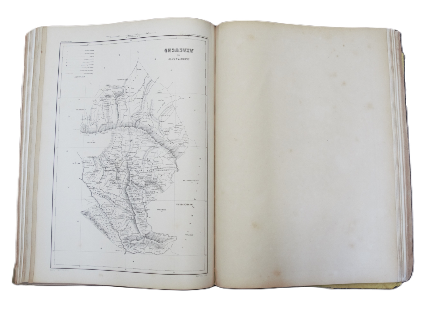 Paz Soldan, Mariano Felipe. Atlas geografico del Perù. 81 S. 74 (von 73) teils kolorierte Tafeln in Holzstich und Lithographie. 52 x 38,5 cm. Pappband d. Z. (stark lädiert, VDeckel lose, Rücken fehlt). Paris, Fermin Didot Hermanos, 1865.