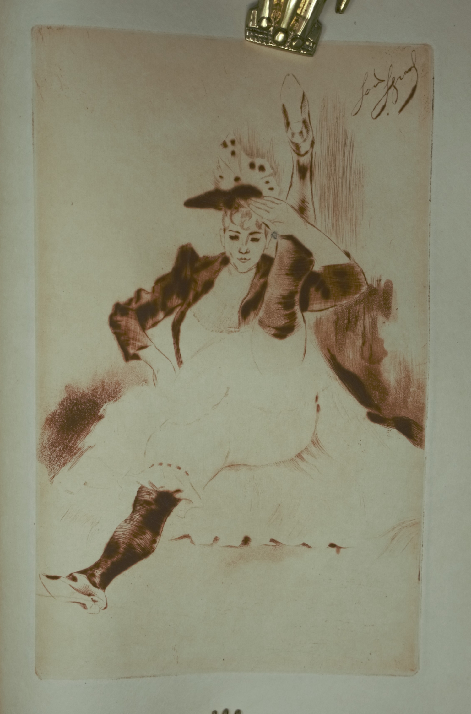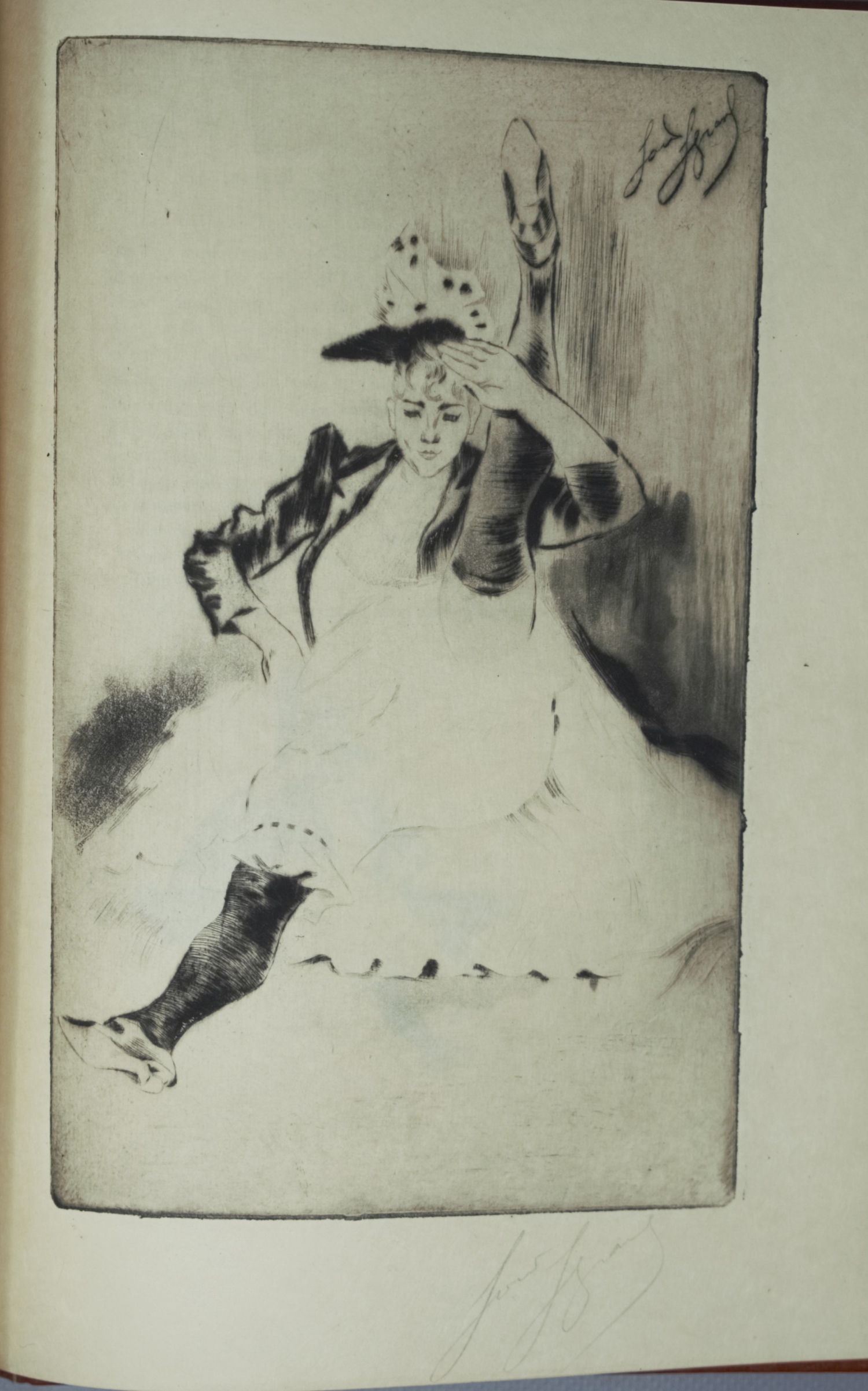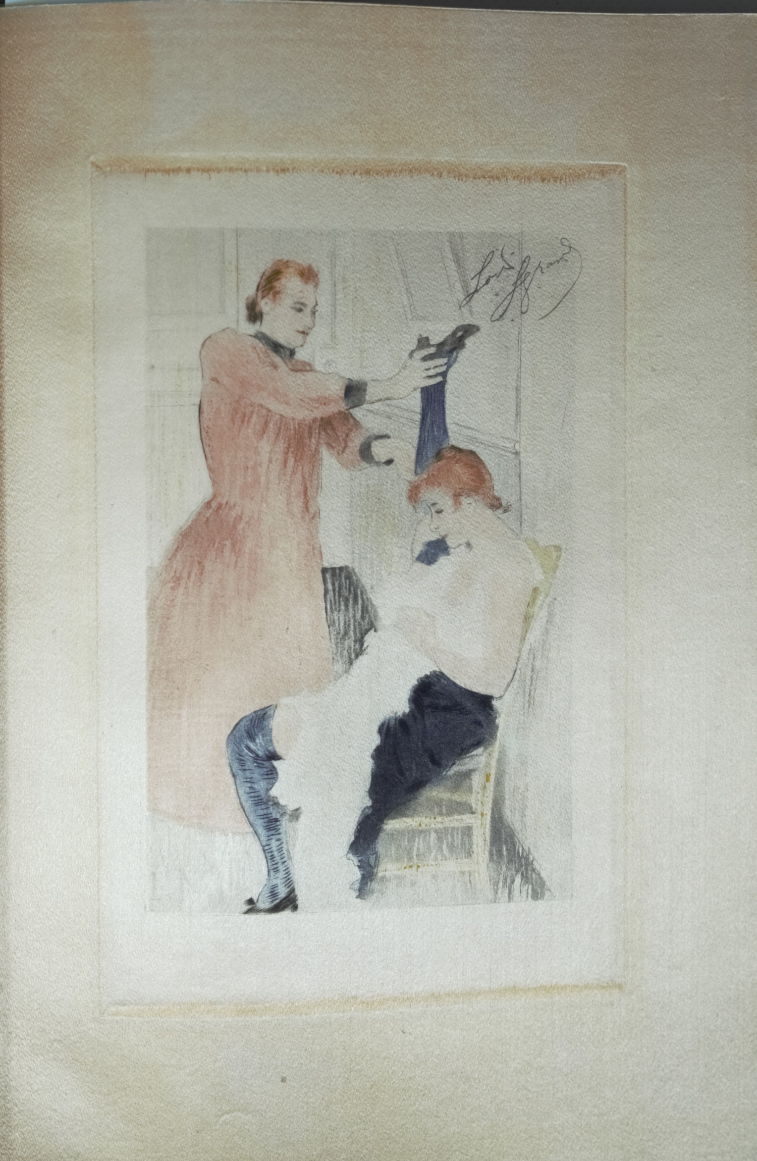 "Legrand made thirteen etchings from watercolor originals for this book. There are also a number of colored initials and vignettes in the text. The etchings are exercises in Zolaesque naturalism. No more than with Degas is there anything titillating about the dancers' poses, indeed Legrand seems to have selected their most difficult positions ...". (Ray II, S. 446f.).