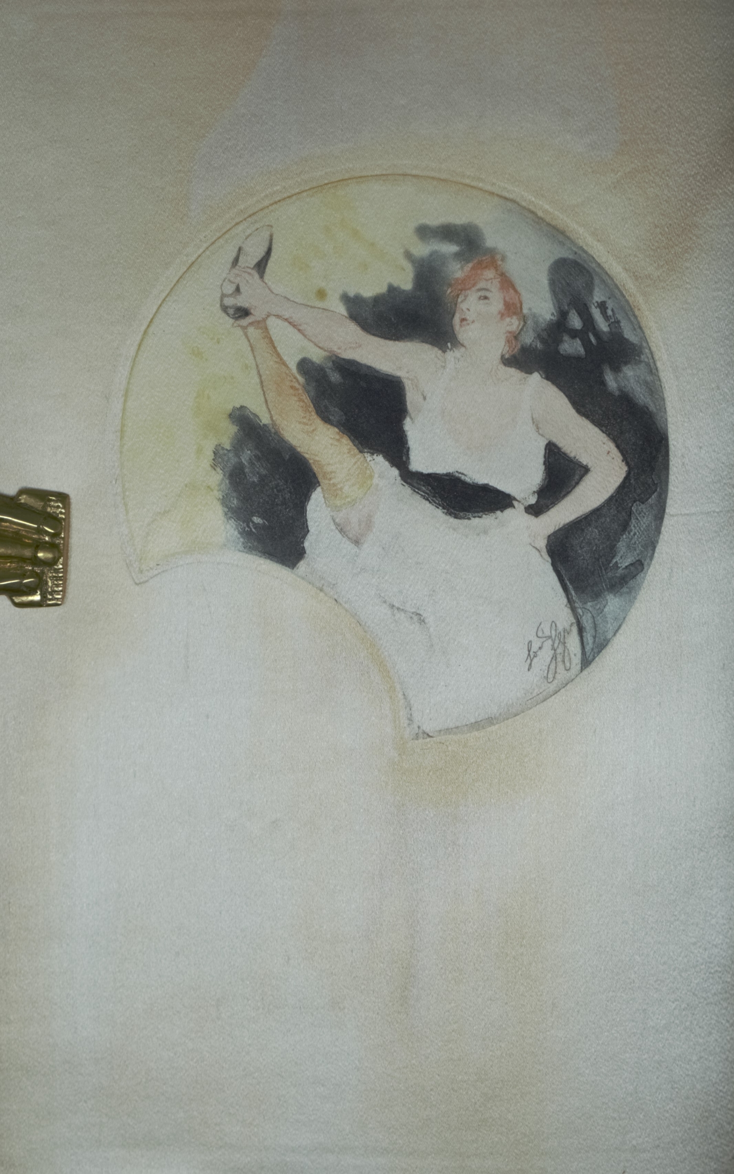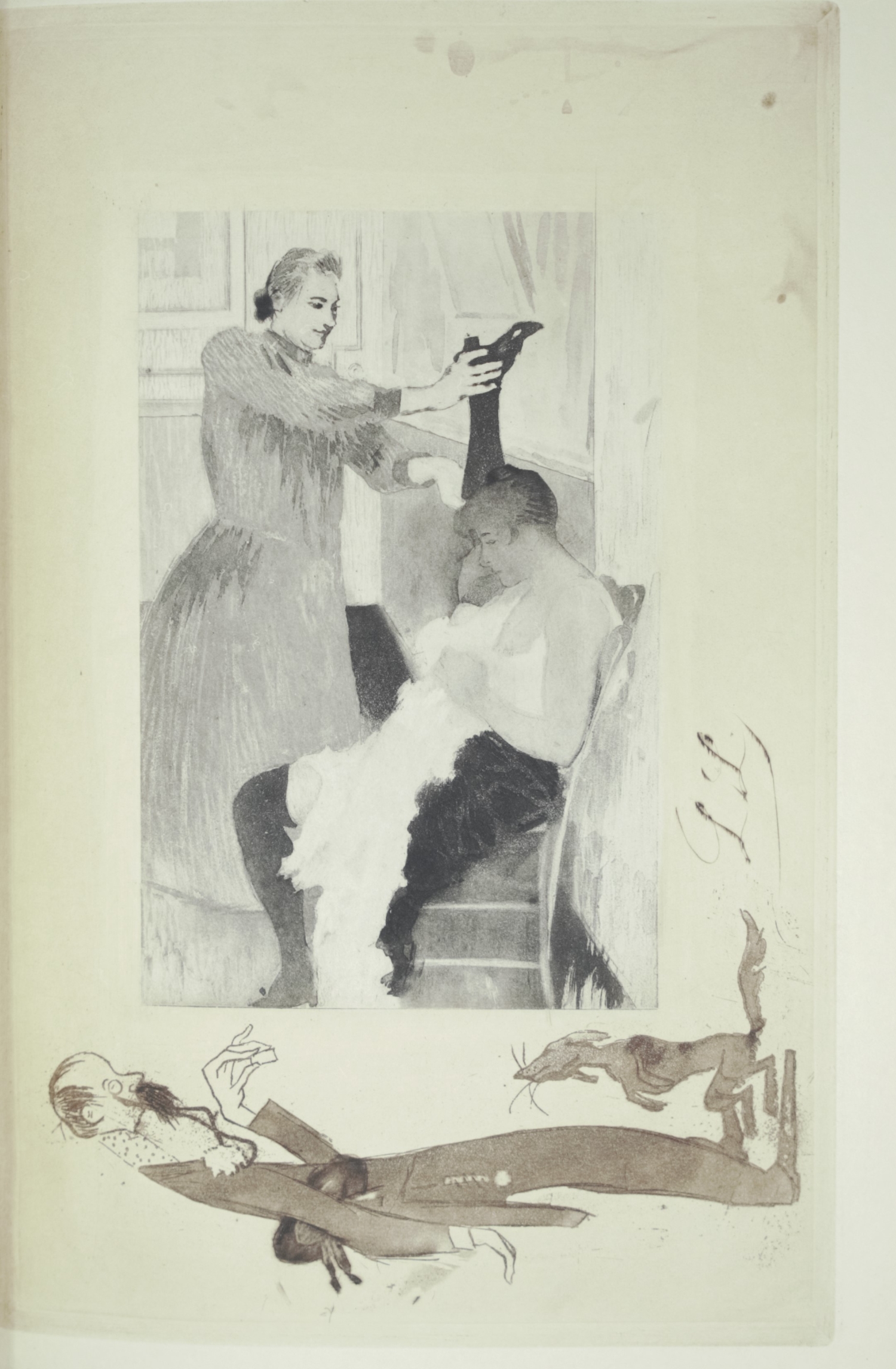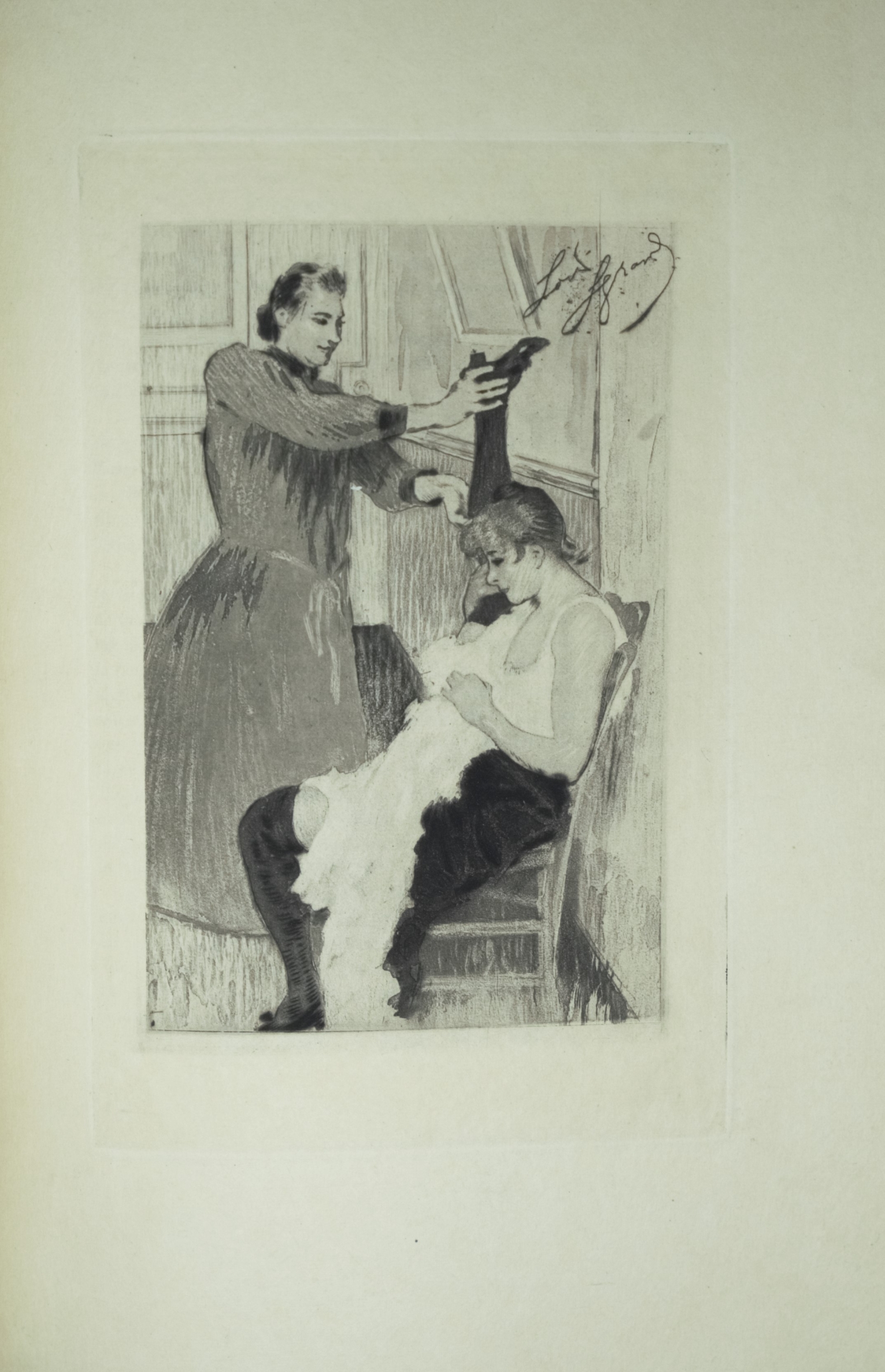"Legrand made thirteen etchings from watercolor originals for this book. There are also a number of colored initials and vignettes in the text. The etchings are exercises in Zolaesque naturalism. No more than with Degas is there anything titillating about the dancers' poses, indeed Legrand seems to have selected their most difficult positions ...". (Ray II, S. 446f.).