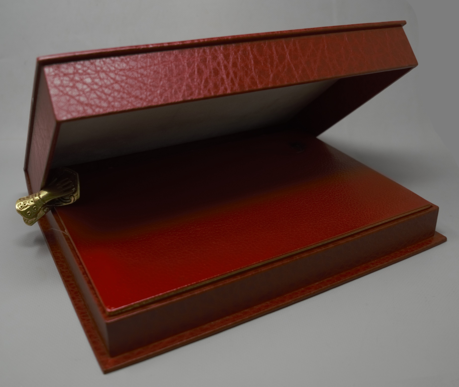 Legrand, Louis. - Cours de Danse. Fin de Siècle. 2 Bl., 56 S., 3 Bl. Titel in Rot und Schwarz. Mit 11 Original-Radierungen auf Tafeln (inkl. Frontispiz), 4 Extrasuiten sowie zahlreichen farbigen Initialen, Kopf-Vignetten und cul-de-lampes von Louis Legrand. 29 x 20,5 cm. Karmesinroter Ganzmaroquinband auf 5 Zierbünden (signiert: Canape R. D.) mit roten Seidenmoiré-Spiegeln und -Vorsätzen sowie 7facher vergoldeter Innenkantenfilete, vergoldetem RTitel und in grünem und blauem Leder intarsierter Lilie, Goldschnitt. In: Burgunderroter Leder-Kassette mit grauem Velours-Leder gefüttert, intarsierter Rochenleder-Bordüre auf den Deckeln, dezenter Vergoldung und vergoldetem RTitel. Paris, Dentu, 1892.