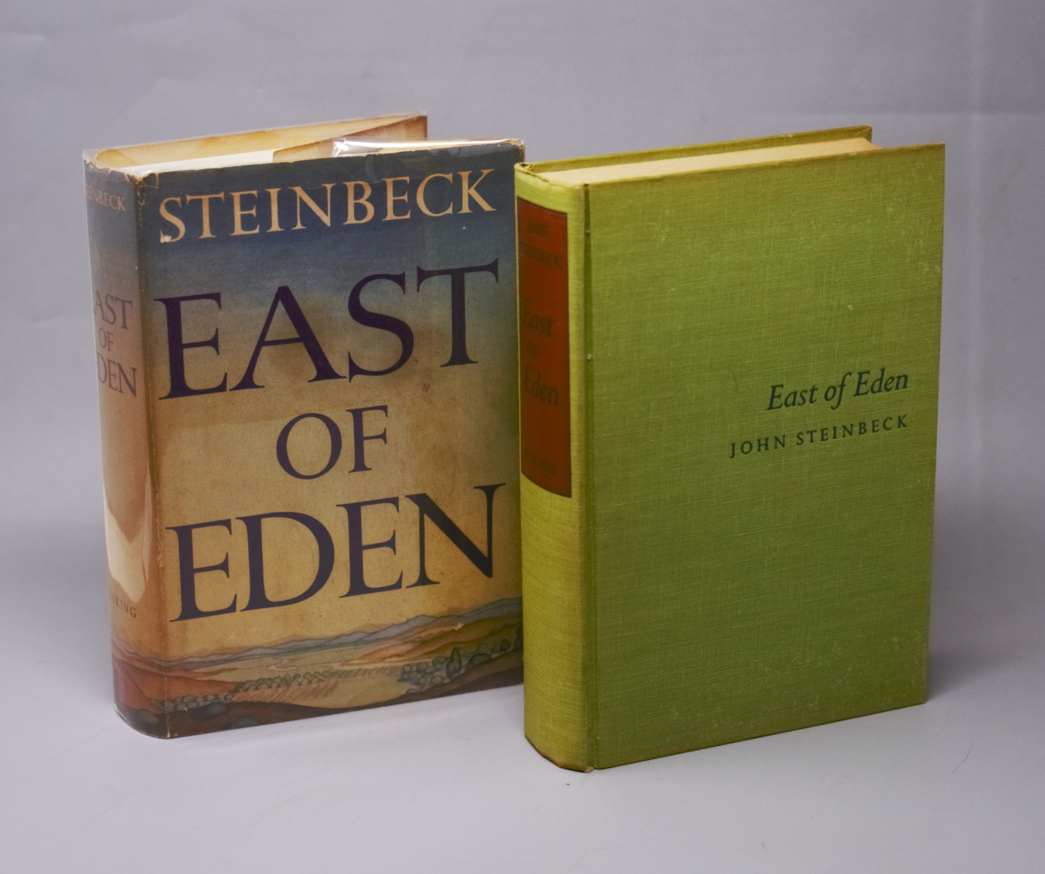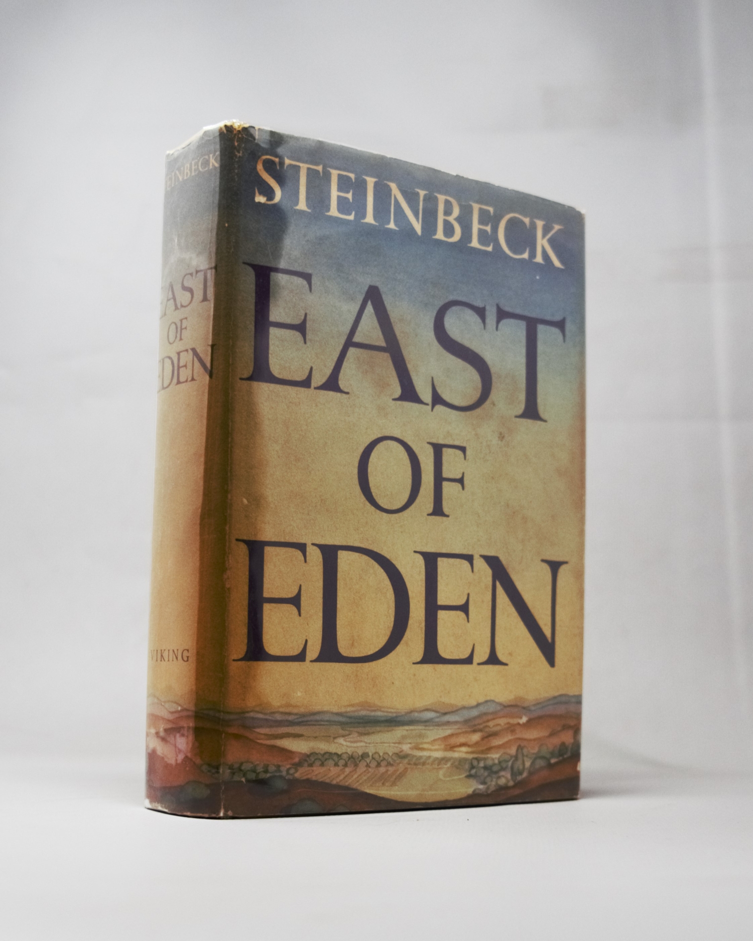 Steinbeck, John. East of Eden. 3 Bl., 602 S. 21 x 14 cm. OLeinen mit illustr. OSchutzumschlag (leicht gebräunt; minimale Knitterspuren am Rand; Rücken mit minimaler Randläsur; eine Ecke mit kl. Transparentklebestreifen fixiert). New York, The Viking Press, 1952.