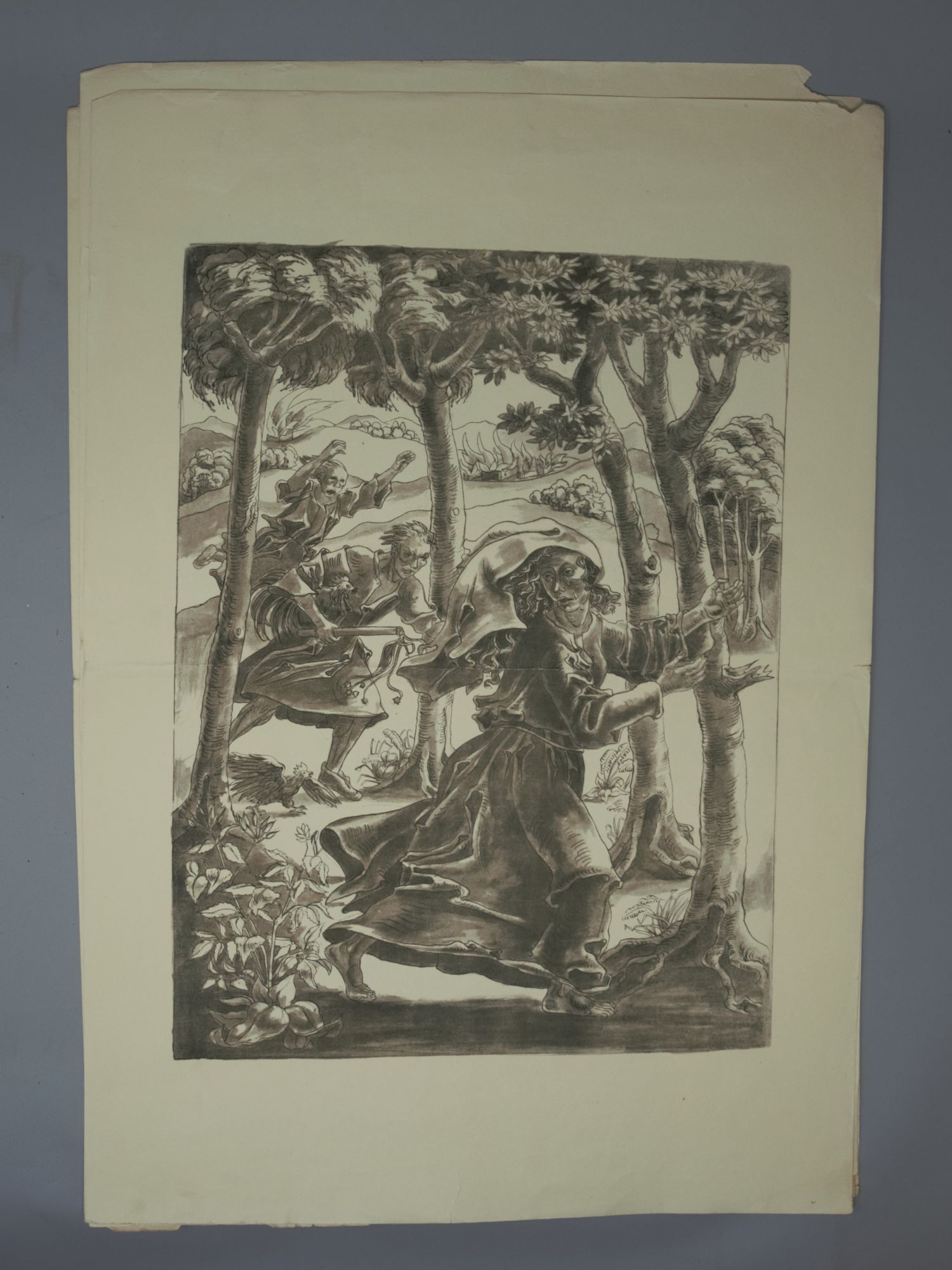 Voigt, M(arie) E(lisabeth). Acht Zeichnungen zu Löns Wehrwolf. 1 Bl. Mit 8 Tafeln. 48,5 x 33,5 cm. Lose Blatt ohne Einband. Berchtesgaden-Schönau, Der Innere Kreis, (1924).