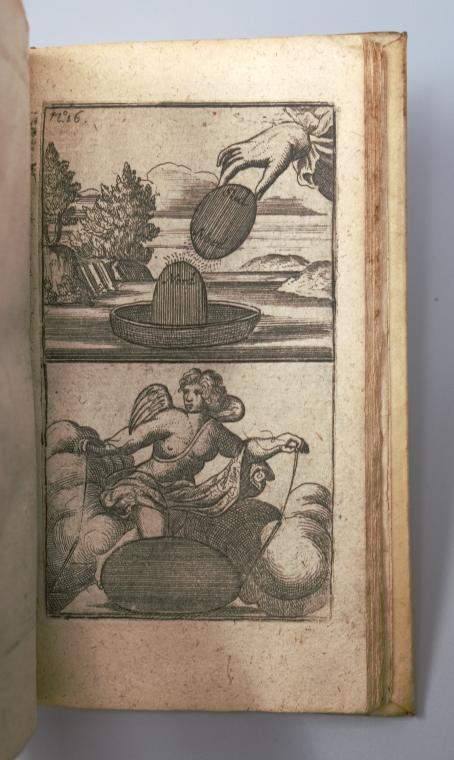 (Kohlhans, Johann Christoph). Curiositäten Neu-erfundene mathematische und optische Curiositäten. Erster und zweiter Theil. 2 in 1 Band. 80 S.; 77 S., 1 Bl. Mit 70 Kupfertafeln. 16, 5 x 9 cm. Pergament d. Z. (leicht fleckig und geworfen). Mainz, Ludwig Bourgeat, 1701.