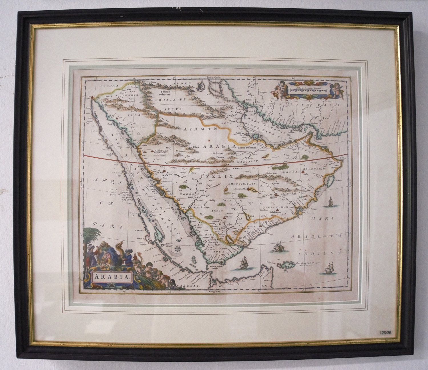 Blaeu, Johannes. Arabia. Kolorierte Kupferkarte. 41,5 x 52 cm (Plattenrand). Unter Glas mit Passepartout in goldgeprägter Holzprofilleiste. Amsterdam 1661.