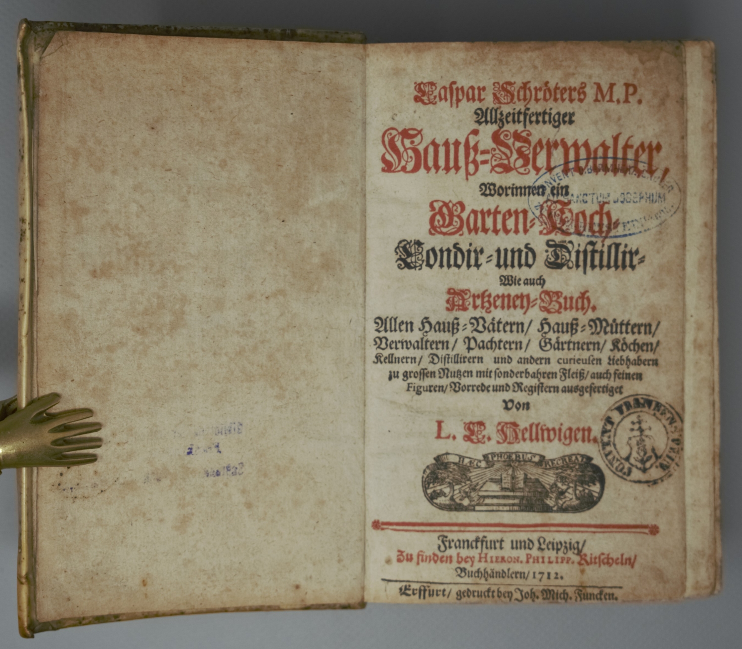 VD18 1101296X. Jöcher II, 1479. Weiss 3497 – Einzige Ausgabe. Der Arzt, Stadtphysicus zu Bad Tennstedt und Erfurt, Publizist und Schöpfer des "Hundertjährigen Kalenders", Christoph von Hellwig (1663-1721), vermittelt seinem Leser in diesem seltenen Hausvaterbuch Kenntnisse in den Bereichen der Haus- und Landwirtschaft, der Gastrosophie und der Arzneiwissenschaft. Innerhalb des Kochbuchs berichtet von Hellwig u. a. davon, wie man "ein Junghuhn zu füllen" hat oder wie man "Kalbes-Ohren zu backen" hat. – Exlibris. Vorsatz und Titel mehrfach gestempelt. Im Block leicht verschoben. Gebräunt und braunfleckig.