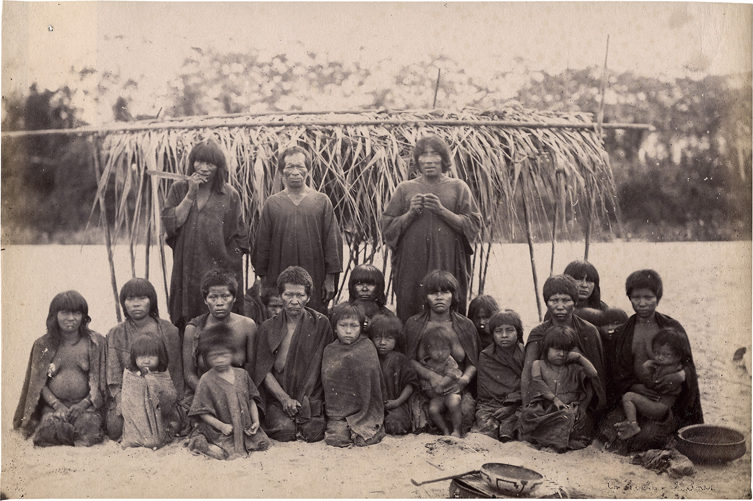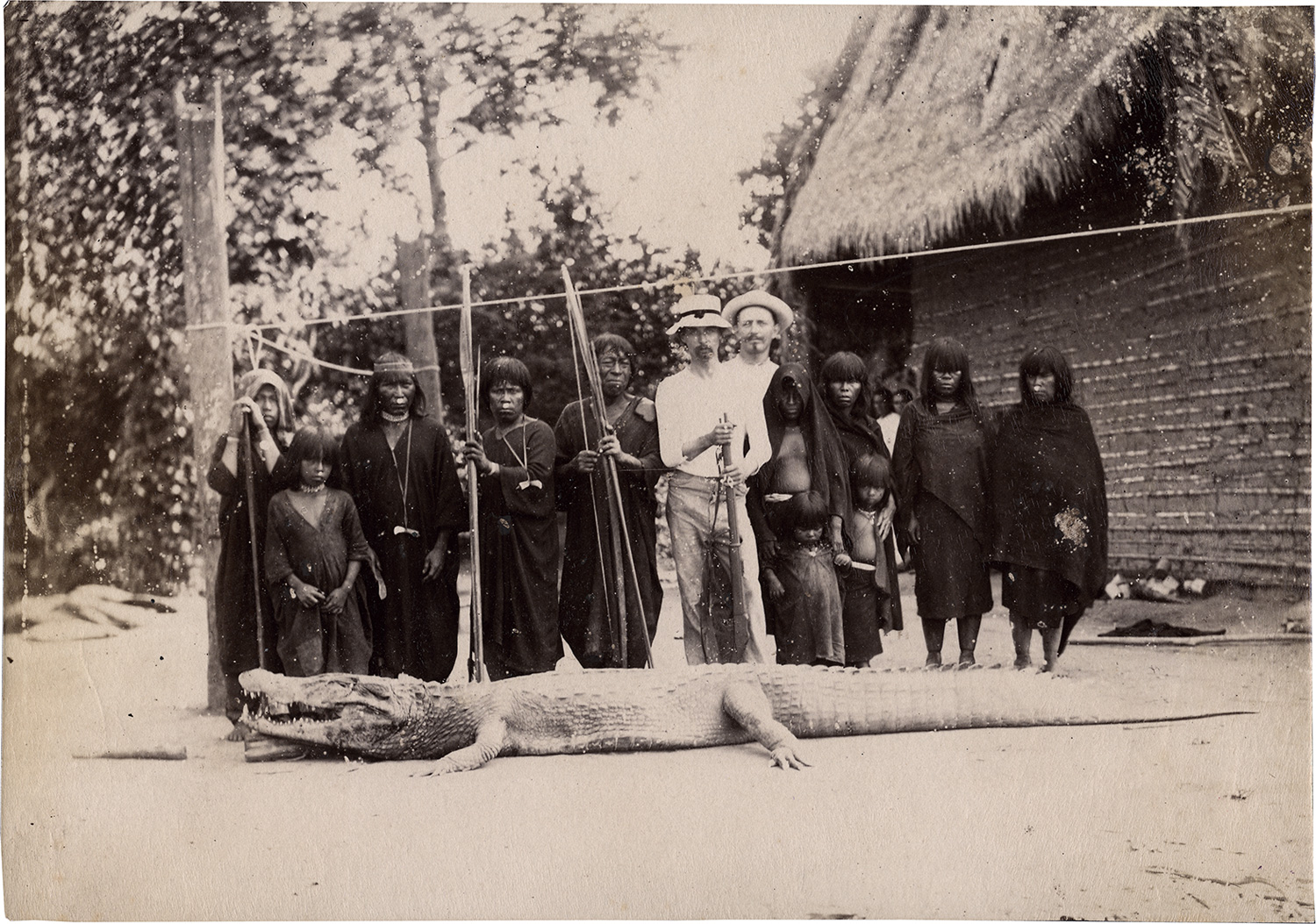 This group of photographs by Charles Kroehle documents daily life and ceremonial practices among Indigenous communities of the Peruvian Amazon, likely the Shipibo or related Panoan-speaking peoples. Included are multi-generational group portraits taken in forest clearings, family scenes before palm-thatched dwellings, and canoeing on the river. Other images depict hunters with spears, women with infants, a crocodile hunting scene showing Indigenous people with Charles Kroehle and Georg Huebner, as well as portraits of men with bow and arrows. Kroehle’s lens combines ethnographic observation with staged composition, offering insight into the colonial encounter and anthropological interests of the late 19th century. – Some fading, especially around the edges, light handling creases and minor surface irregularities, otherwise all in good to very good condition. With: 1 albumen print showing Andean highland people.