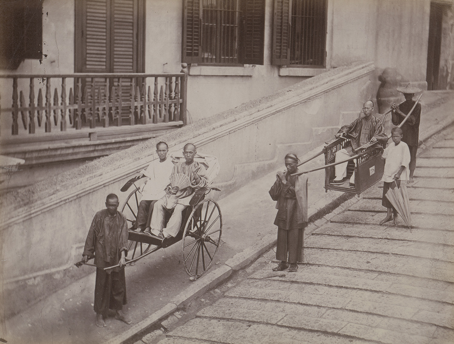 This remarkable group of photographs captures main sites of colonial-era Hong Kong in the late 19th century, including Victoria Harbour, Queen’s Road Central, St. John’s Cathedral, the Zoological and Botanical Gardens, as well as the iconic stone steps of Pottinger Street with sedan chair and rickshaw bearers. Finely rendered in tone and detail, the prints exemplify the technical and compositional refinement of Lai Afong and Pun Lun - two of the most important studios active in Hong Kong at the time. – Some prints slightly faded, some with handling creases and small tears, otherwise all in good to very good condition.