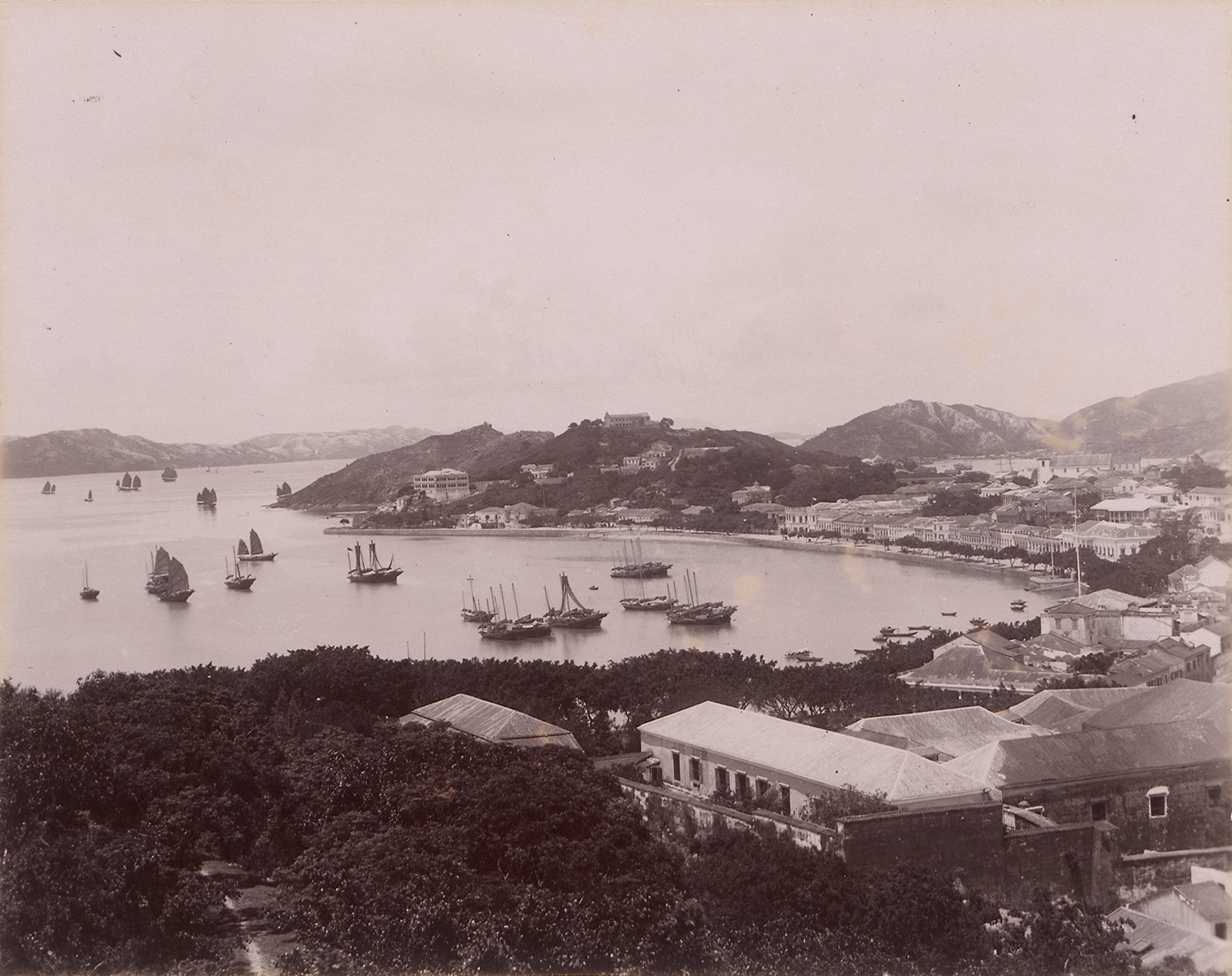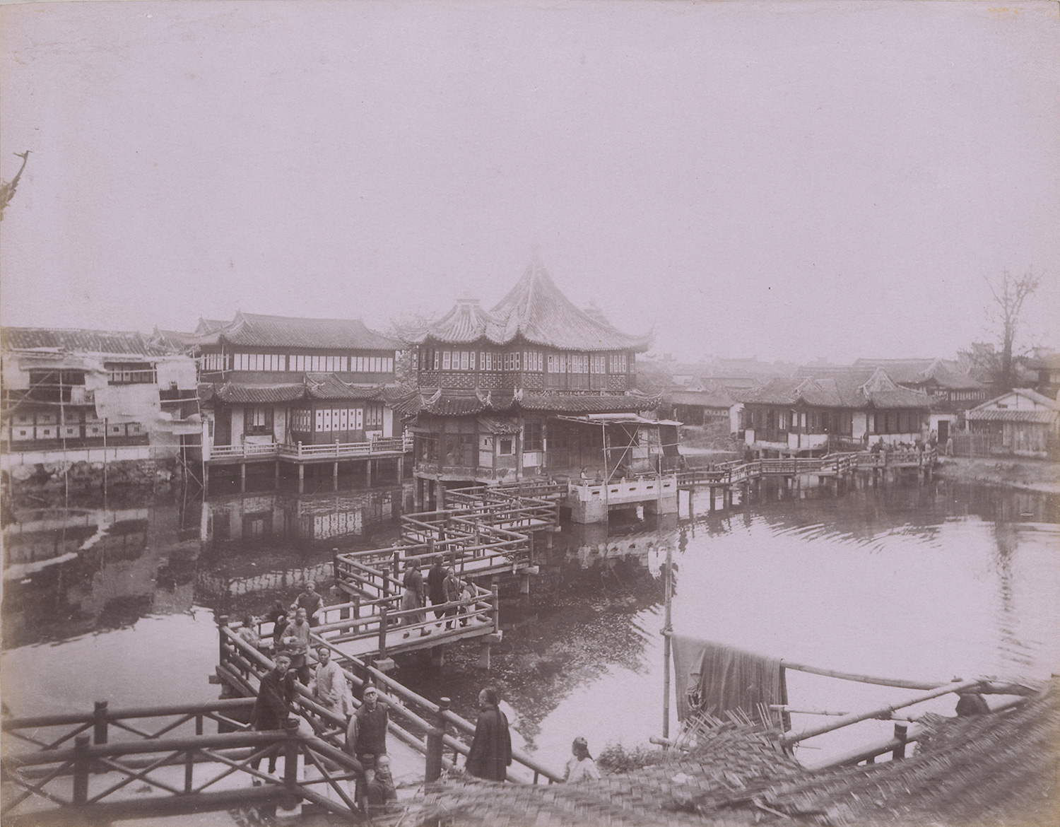 Taken across several locations in southern China, this group includes views and portraits likely made in and around Canton (Guangzhou), Hong Kong, Shanghai, and Macau in the late 19th century. The photographs depict pagodas, temple grounds, stone bridges, the Willow Pattern Tea House, Tianfei Gong temple, and streets such as Queen’s Road and Boone Road. Also featured are village scenes, harbor areas, and studio portraits of Chinese women and girls in traditional dress, some with bound feet. – Some fading, foxing, and discoloration on some prints; some scuff marks; otherwise all in good to very good condition.