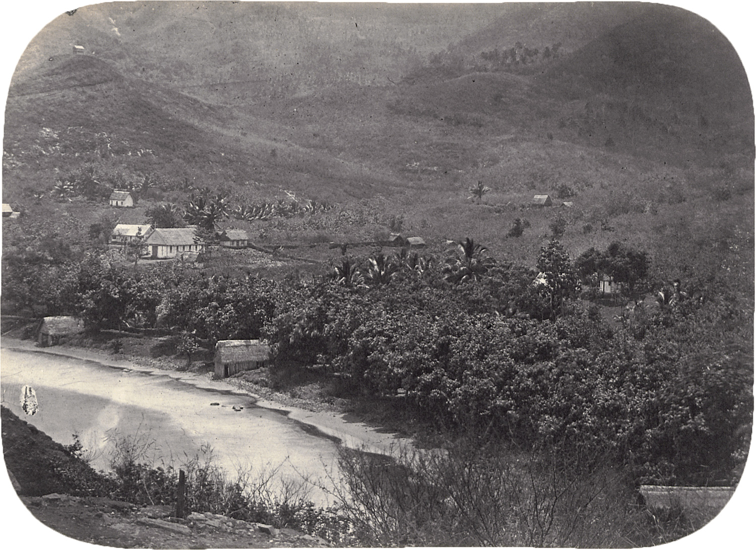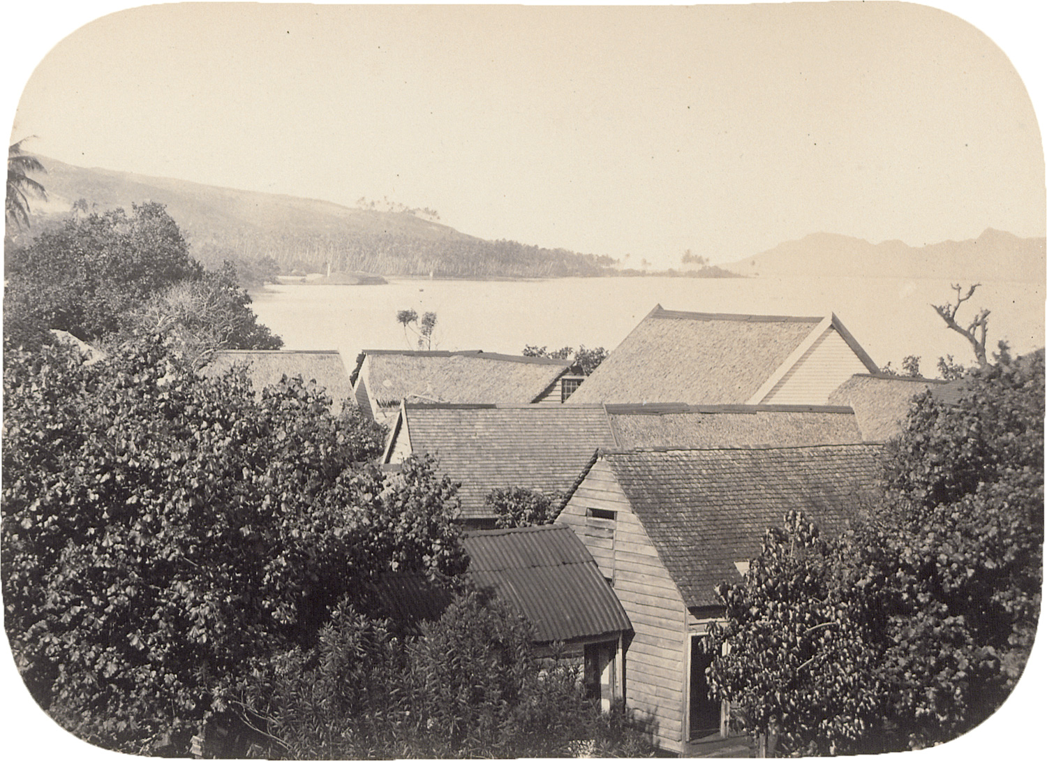 Souvenirs de l’Ile Tahiti et des Marquises. 1863. 21 albumen prints, mounted to album pages. Each ca. 11 x 15,5 cm or reverse (22 x 29 cm). Each with “Courret Hermanos Fotógrafos Calle Mercaderes 197, Lima” blind stamp on the mount, annotated in black ink below the image. Bound in green half-leather album with gilt-stamped title "Souvenirs de l’Ile Tahiti et des Marquises" in rhombus cartouche on front cover. Housed in a custom clamshell box covered in green faux-leather with mounted printed title label bordered by four diamond-shaped wooden inlays (entire size 30 x 41 cm).