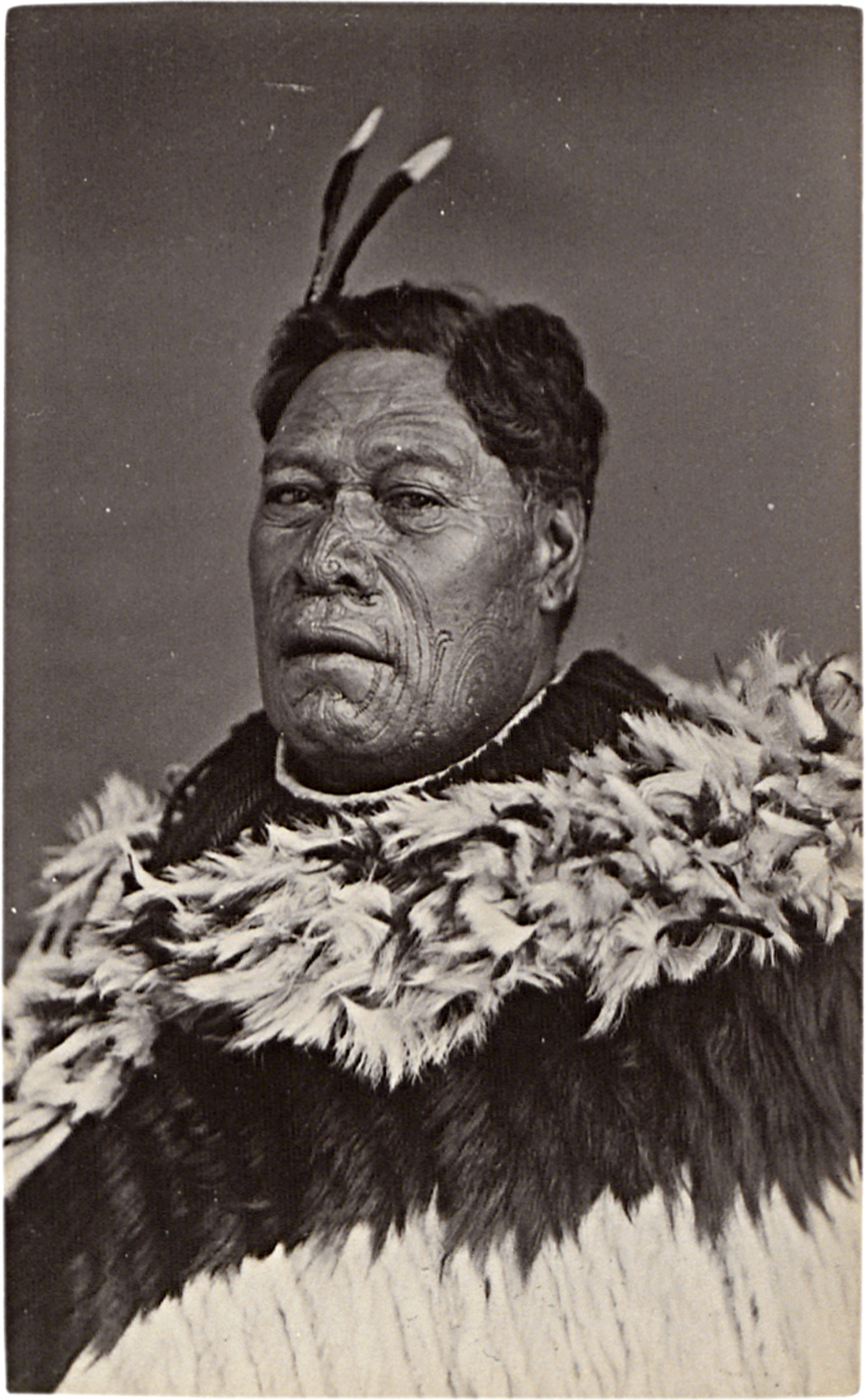 This group comprises both individual and composite portraits of prominent Maori figures, including Chief Tawhiao, Kawiti, Mohi, Rewi, and Ringorī. Several appear in a photographic montage combining eleven portraits with ethnographic views: a carved meeting house, the settlement at Parihaka, a Rotorua village scene, a war canoe, and six carved figurative sculptures. A print of this montage is held in the British Museum collection. Also included are a larger photograph of a traditional Maori dwelling and several smaller-format studio portraits, offering a rare visual record of Maori leadership and culture in the late 19th century. – Mounts slightly time-stained in edges. Prints in good condition.