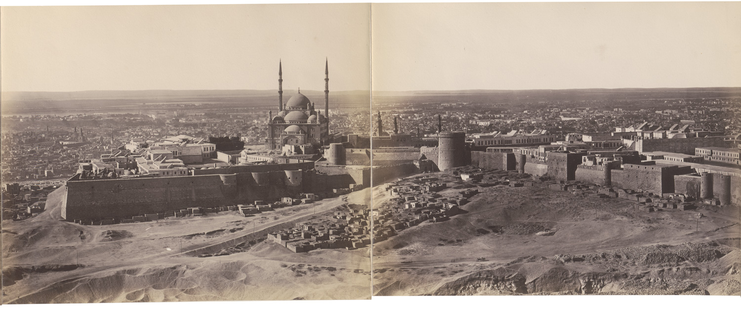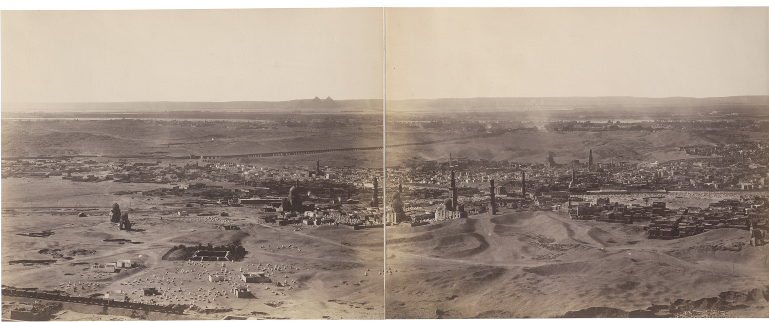 This six-part panorama of Cairo, attributed to Pascal Sébah, depicts a sweeping view of the city’s historical and architectural landmarks, including such sites as the Muhammad Ali Mosque, the Cairo Citadel, the aqueduct, the northern cemetery, and the mosques of Sultan Hassan and al-Rifa’i among others. – Boards slightly toned, folder slightly soiled and with some spots, some fading at folds of prints, otherwise in very good condition.