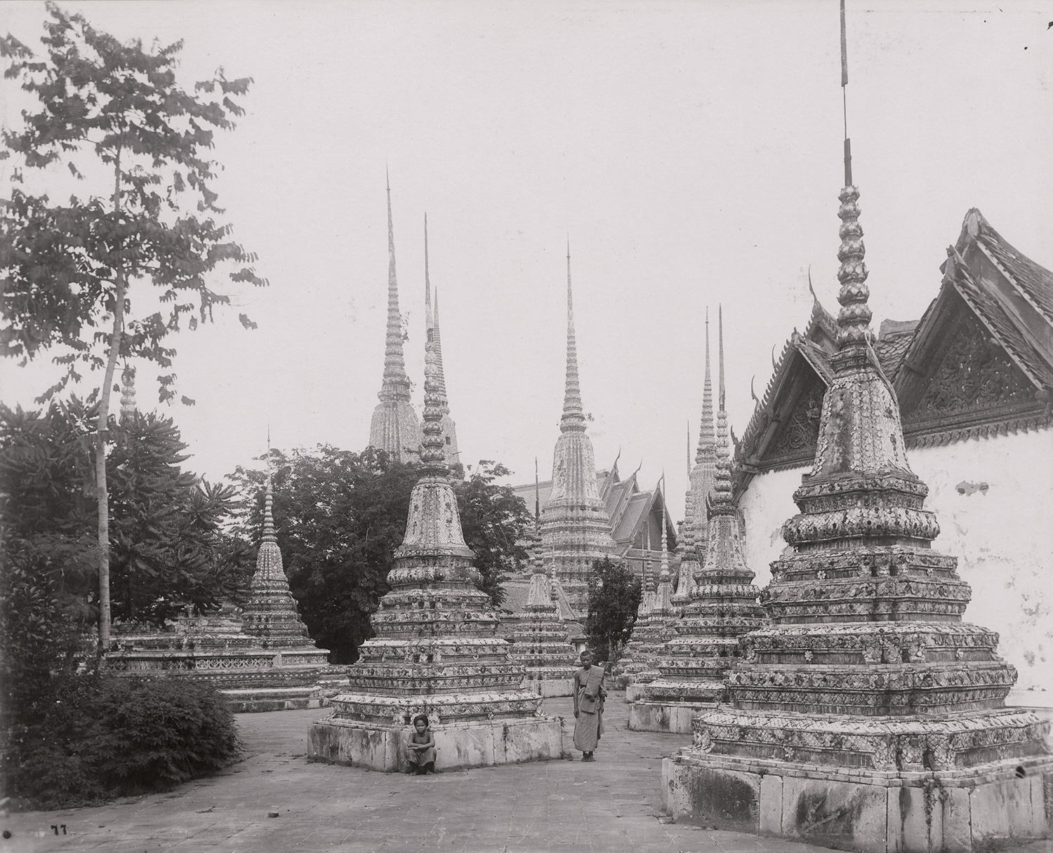 This group of photographs records significant religious, architectural, and urban sites in Siam and British Burma during a documented journey in late 1906. Among the Bangkok scenes are canal-side dwellings near the Golden Mount (Wat Saket), temple complexes such as Wat Pho and Wat Suthat, and detailed views of the Grand Palace and Wat Phra Kaeo. Further images show the island temple of Phra Samut Chedi at Paknam, the Shwe Dagon Pagoda in Rangoon from multiple vantage points including the Royal Lake and Cantonment Gardens, and distinctive scenes of Mandalay, including palace walls and a large monastic structure. – Some light scuff marks and minor oxidation along the edges of some prints, otherwise all in very good condition.