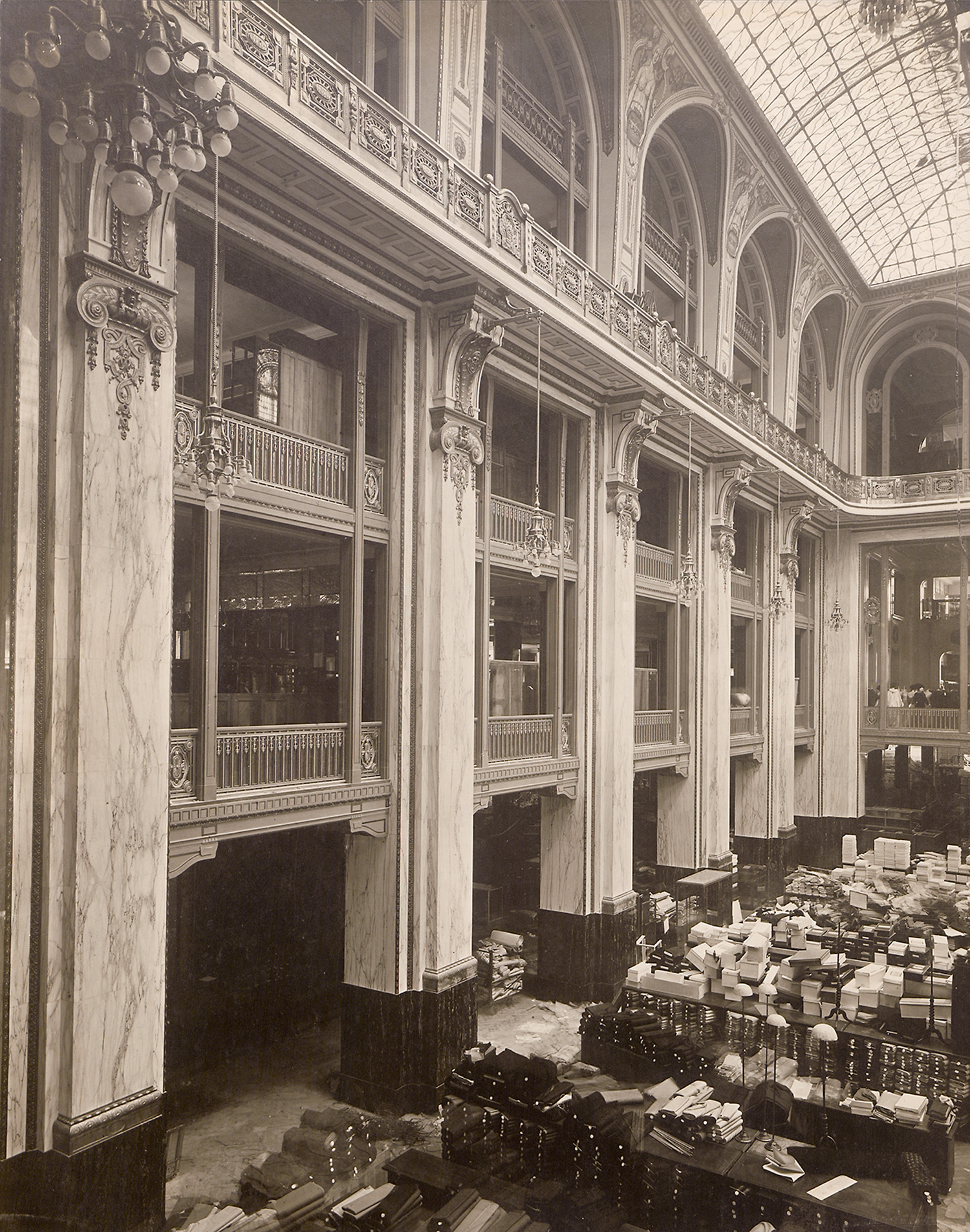 This group of platinum prints documents the stone and marble work of former commercial buildings in Berlin and Hamburg, highlighting the materials and craftsmanship that defined their façades and interiors. – A few photos with oxidation mirroring in edges, otherwise in very good condition.