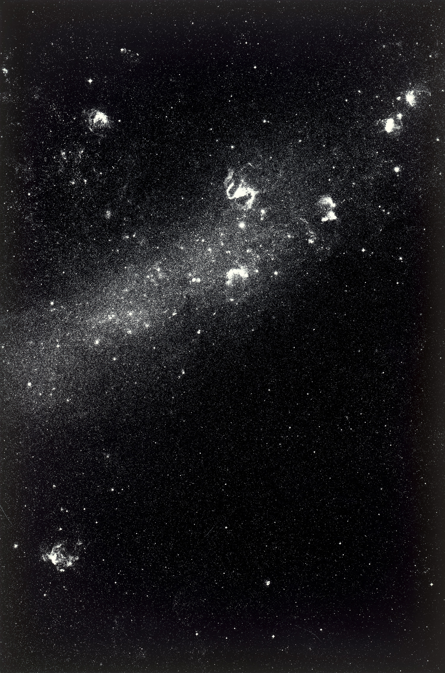 Fascinated by astronomy since childhood, Thomas Ruff eventually integrated this lifelong interest into his diverse photographic practice. In the early stages of his career, he was frustrated by the technical limitations that prevented him from photographing the night sky himself. In 1989, he acquired a set of negatives from the European Southern Observatory, taken using a specialized telescopic lens as part of a systematic effort to chart the visible universe. From this material, Ruff randomly selected star formations, reoriented their perspectives, and dramatically enlarged the images. The resulting works are guided solely by his visual criteria and bear no direct correspondence to observable reality.