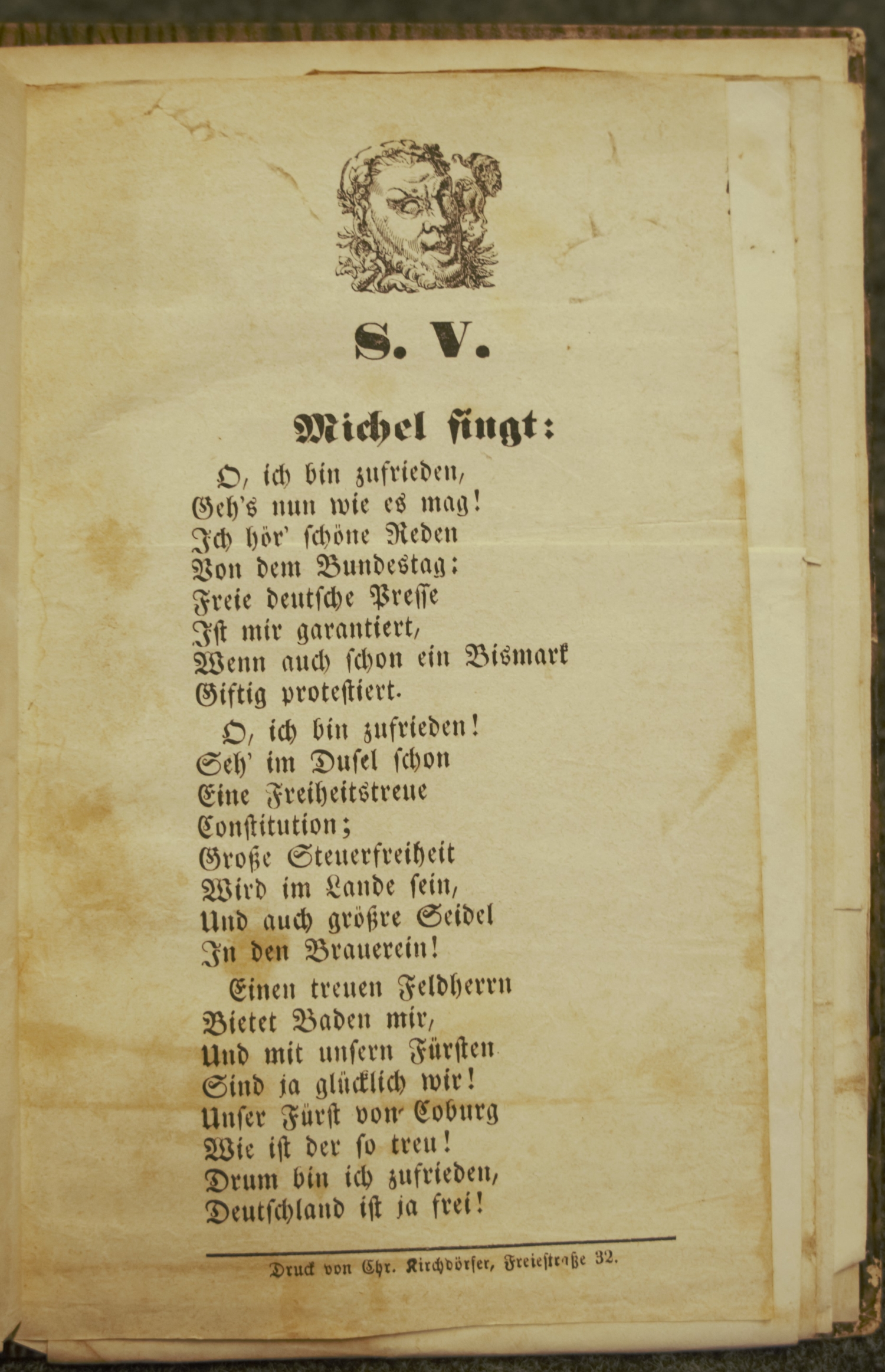 Kuriose Sammlung von Zeitungsausschnitten, Lotterielosen, Programmheften, Liedtexten, Reden, Gedichten und Holzschnitt-Tafeln als Andenken an die Baseler Fastnacht im 19. Jahrhundert. Die Holzschnitttafeln zeigen den Fastnachtszug mit zahlreichen Kostümierten und Musikanten unter dem Titel "Fastnachtszug 1867. Die Gegensätze unserer Zeit oder Krieg & Frieden". – Papierbedingt gebräunt, vereinzelt leicht stockfleckig und knickspurig, teils mit Randläsuren sowie hinterlegten Fehlstellen.