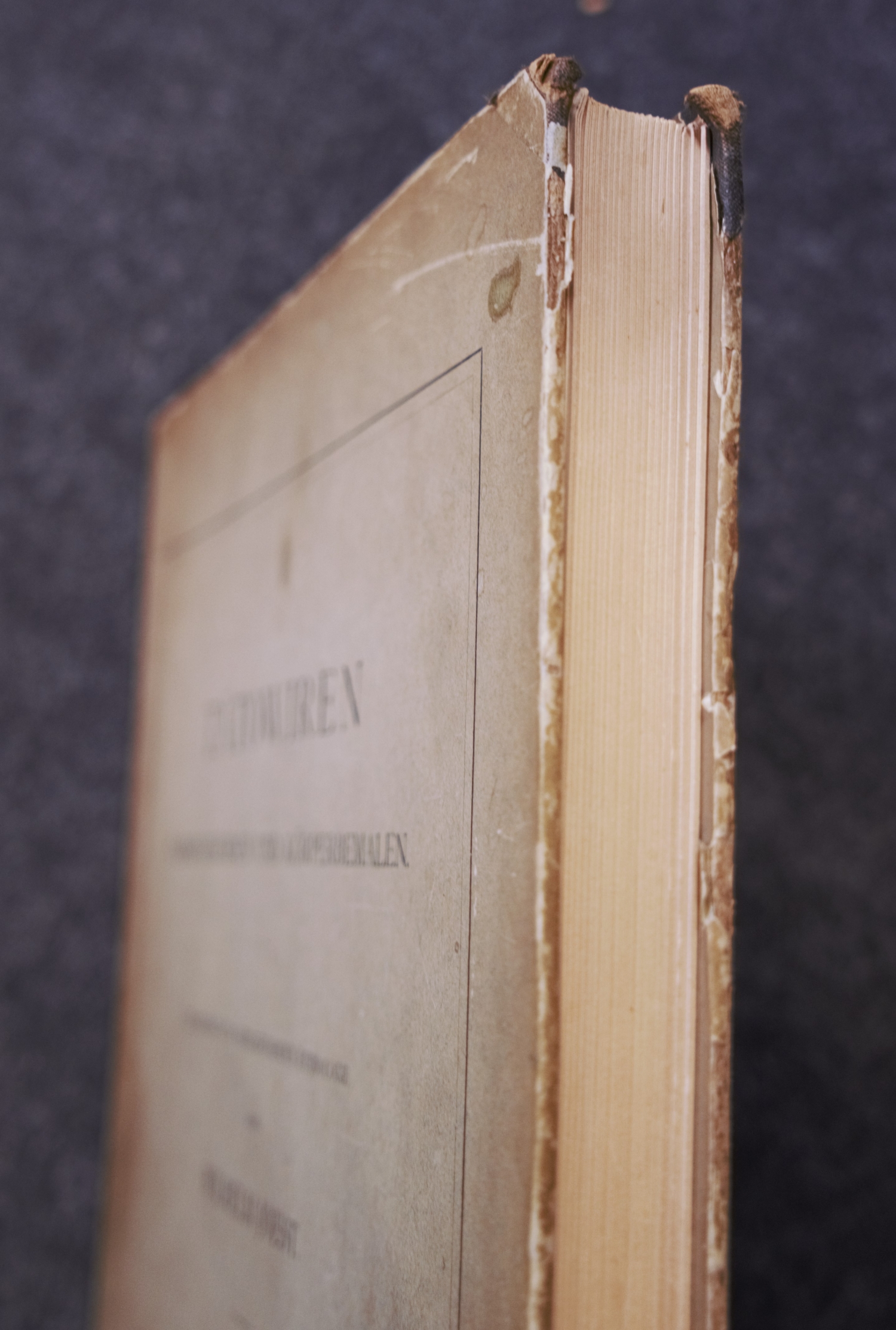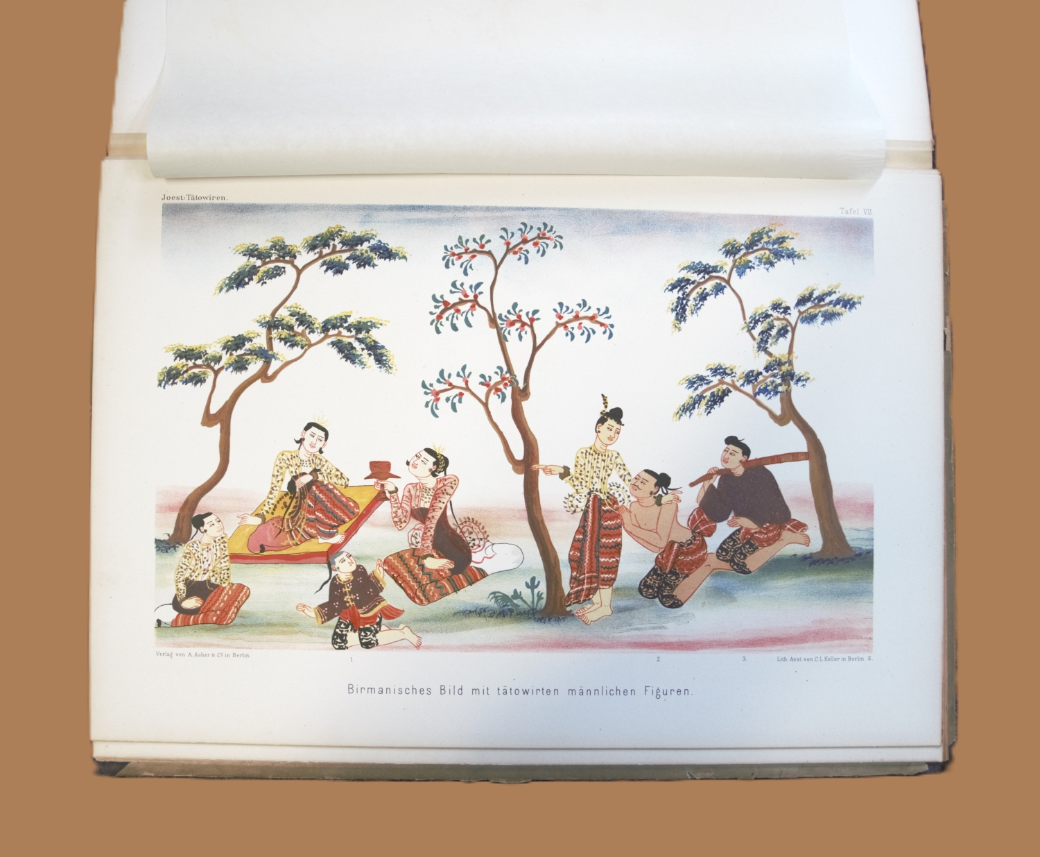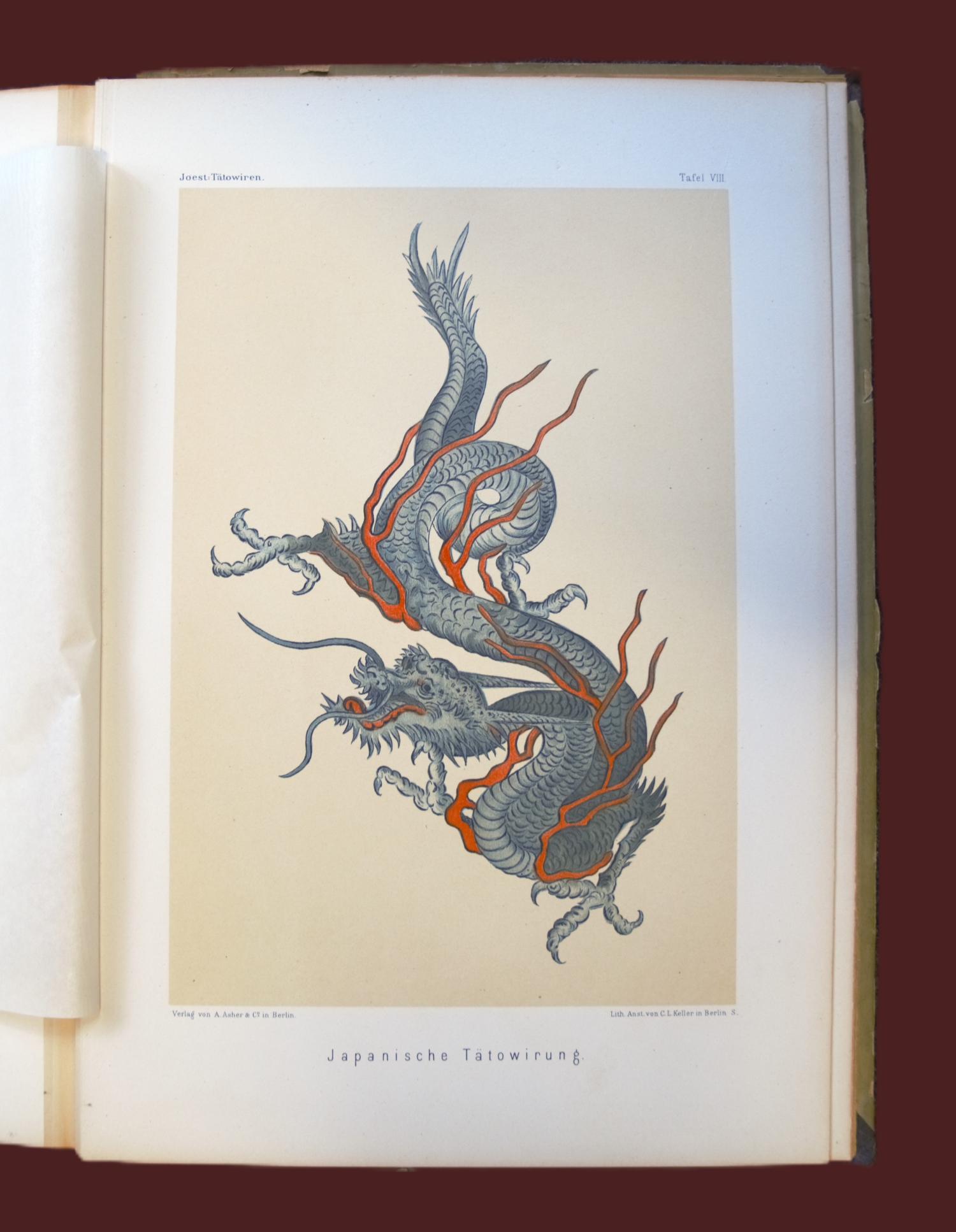 Joest, Wilhelm. Tätowiren, Narbenzeichnen und Körperbemalen. Ein Beitrag zur vergleichenden Ethnologie. Mit 11 chromolithographischen Tafeln, 1 Lichtdrucktafel und 30 Zinkätzungen nach Original-Zeichnungen. 1 Bl., VIII, 128 S. 38 x 26 cm. OHalbleinen (fleckig, beschabt und bestoßen) mit goldgeprägtem RSchild und Deckeltitel. Berlin, Asher, 1887.