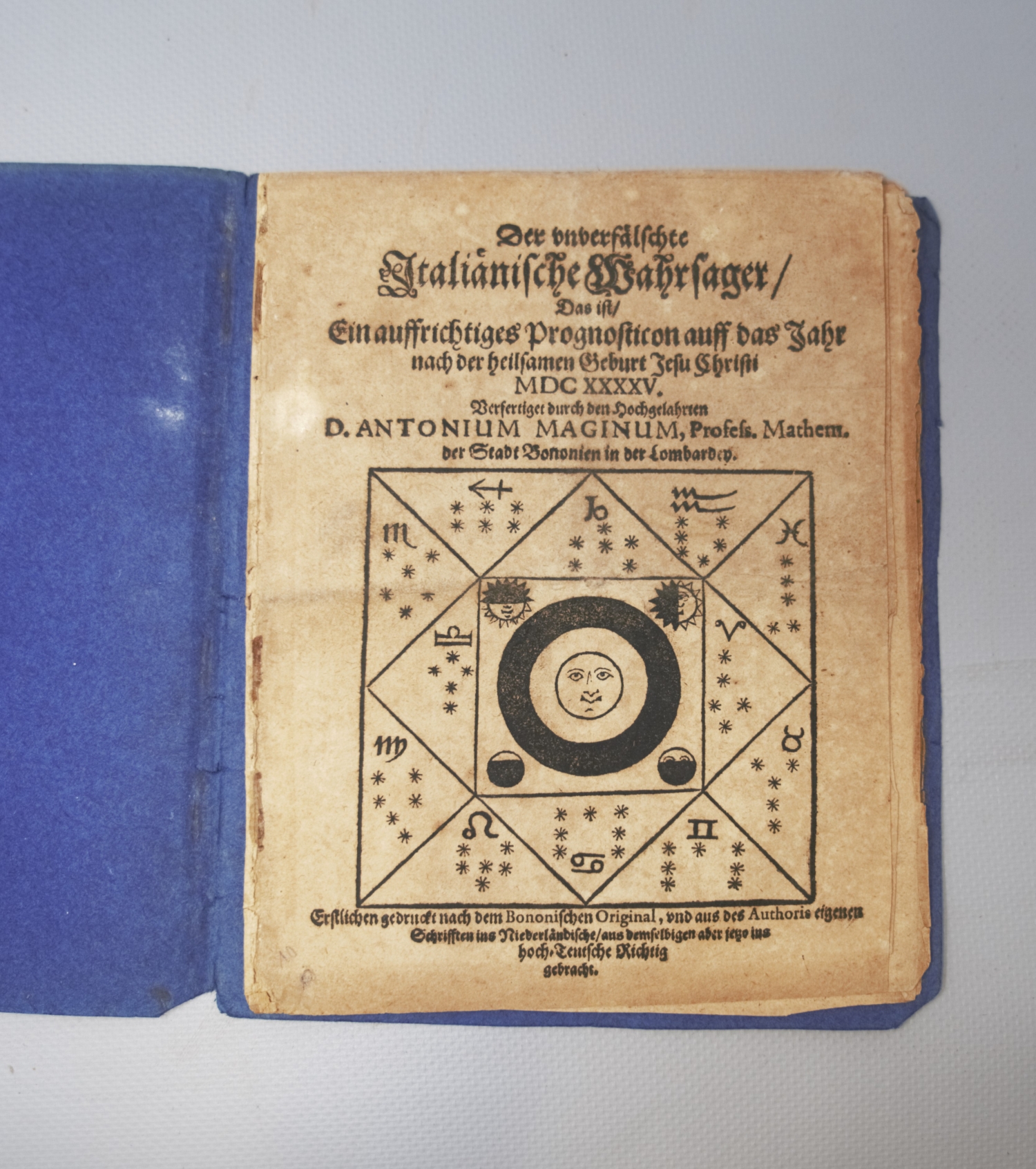 Magini, Giovanni Antonio. Der unverfälschte italiänische Wahrsager. Das ist ein auffrichtiges Prognosticon auff das Jahr nach der heilsamen Geburt Jesu christi 1645. 8 Bl. Mit großer Holzschnitt-Vignette auf dem Titel. Moderner Broschur-Umschlag (leicht lichtrandig und mit Randläsuren). O. O., Dr. und J. (wohl 1644).