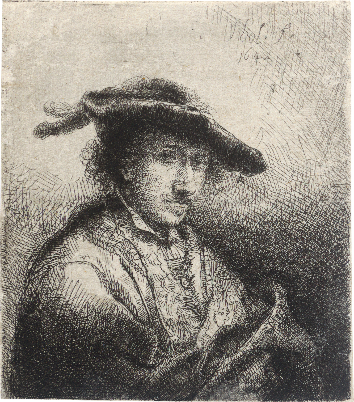 Junger Mann, ein Federbarett tragend. Radierung. 8,9 x 7,8 cm. 1642. B. 13, Rovinski 13, Hollstein 14.