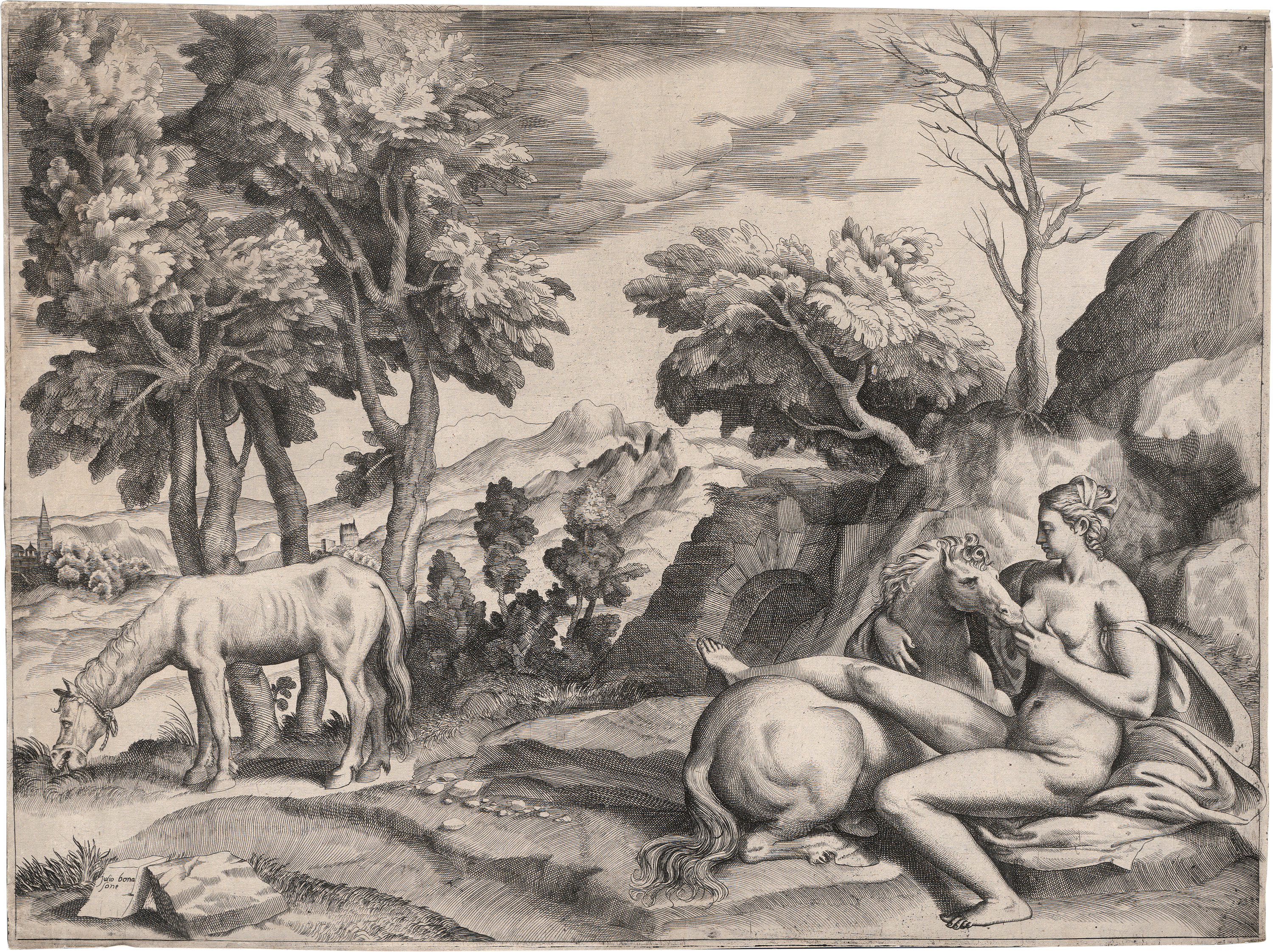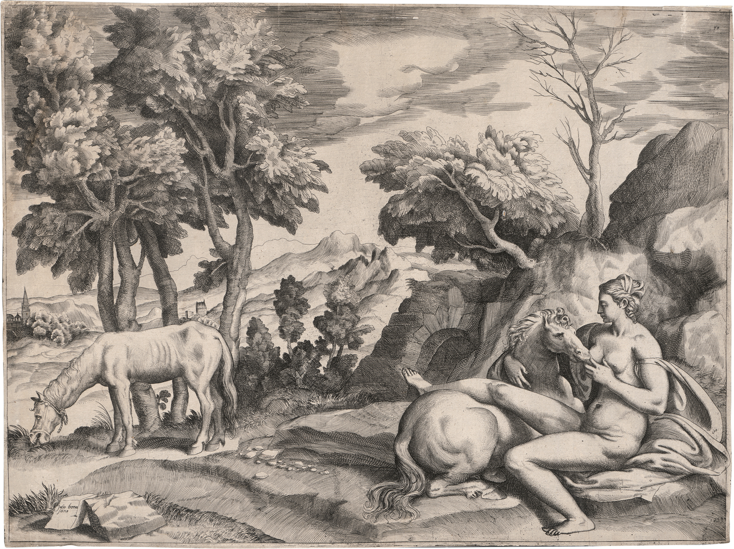 Saturn in Gestalt eines Pferdes bei der Nymphe Philyris. Kupferstich nach Giulio Romano. 32,6 x 43,4 cm. B. 108, Massari 219. Wz. Justitia im Oval (Massari 128).