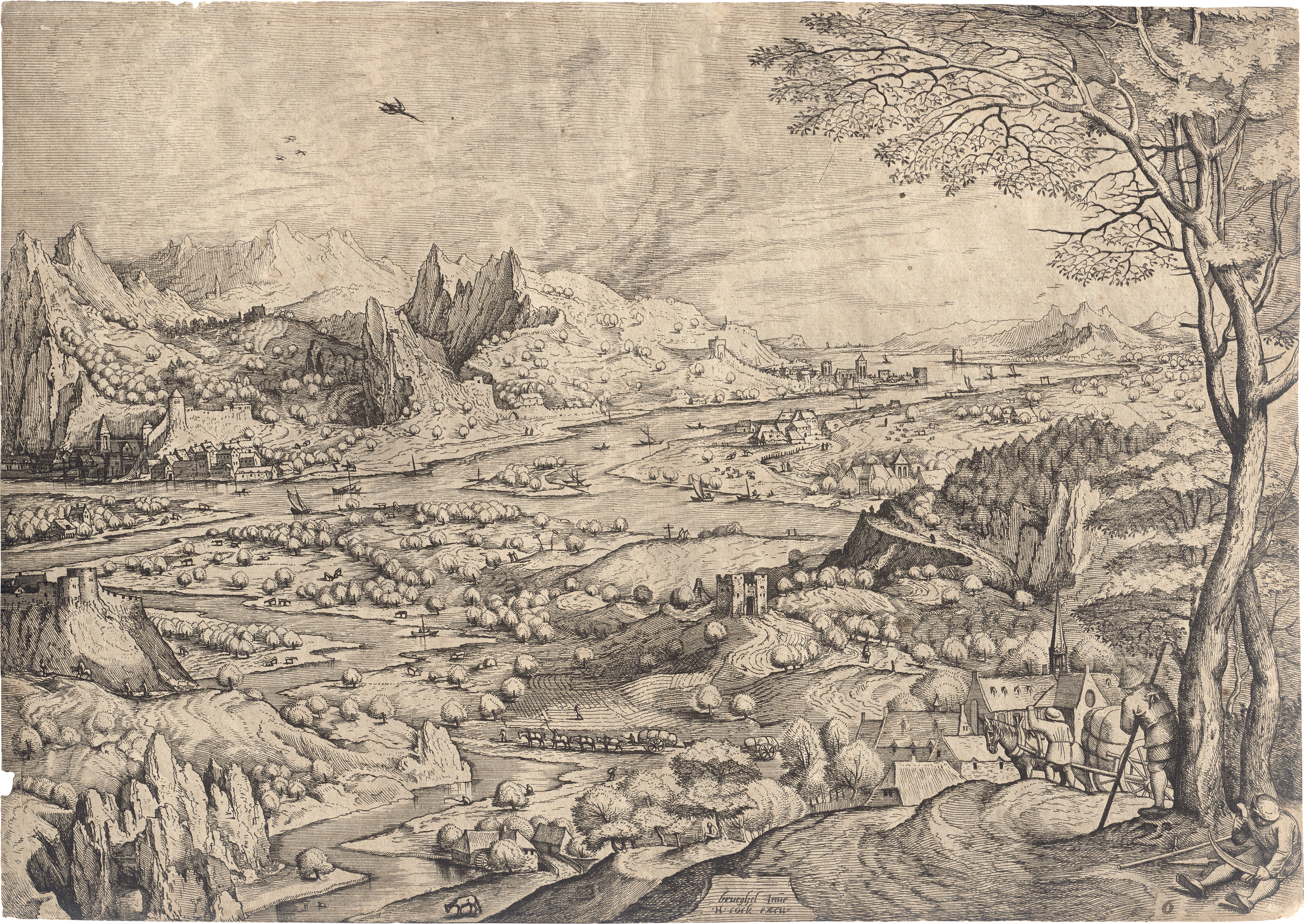 Mit der Adresse von Hieronymus Cock. Ganz ausgezeichneter, kräftiger Abzug, auf die Darstellung geschnitten. Verso geglättete vertikale Mittelfalte, zarte Trockenfältchen, leicht gebräunt sowie fleckig, ganz vereinzelt schwache Rostfleckchen, links in den Bergen zwei kleine hinterlegte Löchlein, im Himmel rechts hinterlegtes Wurmlöchlein, zwei weitere winzige Nadellöchlein in der Landschaft, dünnen Stellen, kleine Rand- bzw. Eckläsuren, links unten mit kleinem Papierverlust, sonst noch gut erhalten.