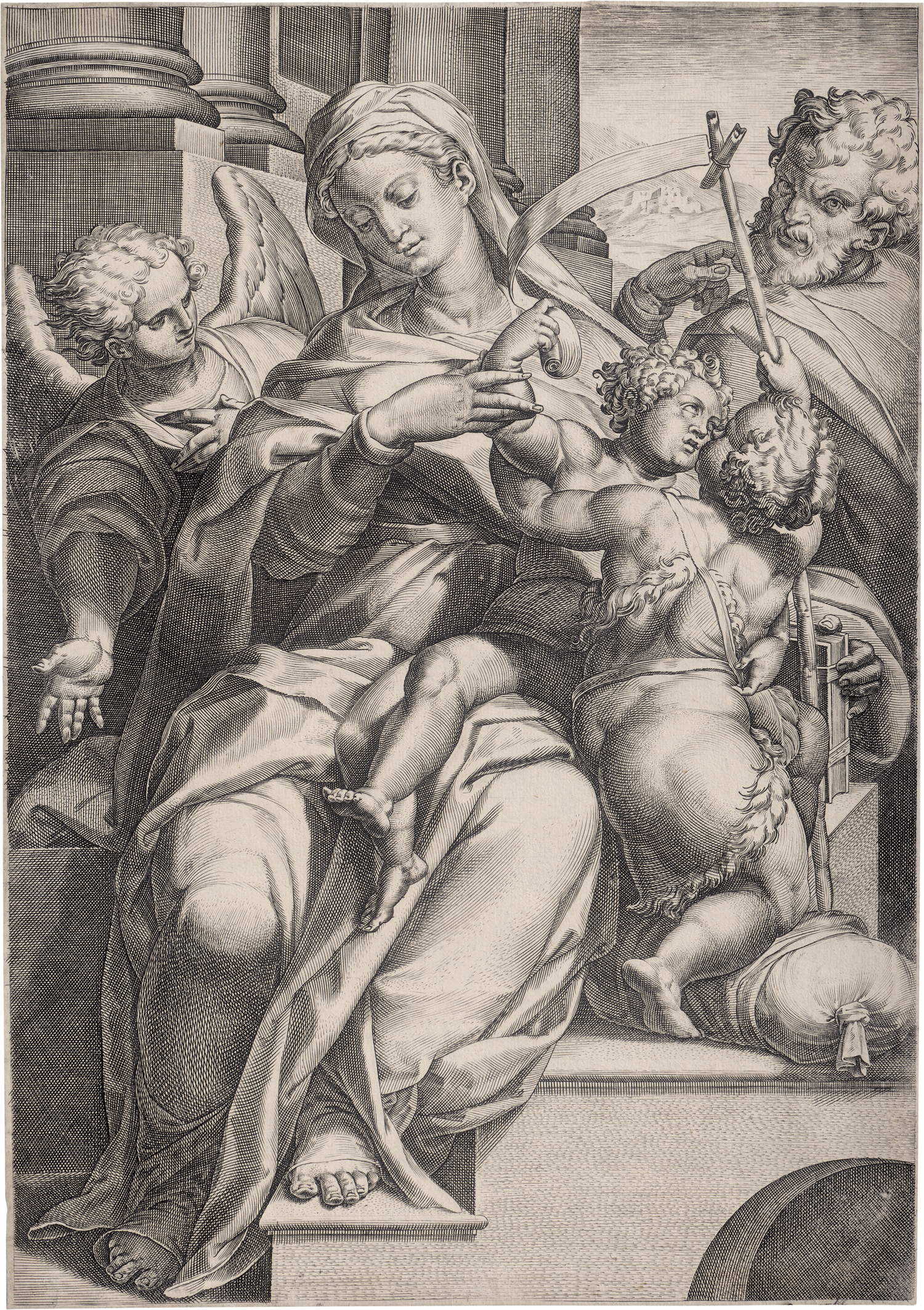 Die Hl. Familie mit Johannes d. Täufer und einem Engel. Kupferstich. 40,4 x 28,2 cm. Um 1582. B. 45, DeGrazia Bohlin 37.
