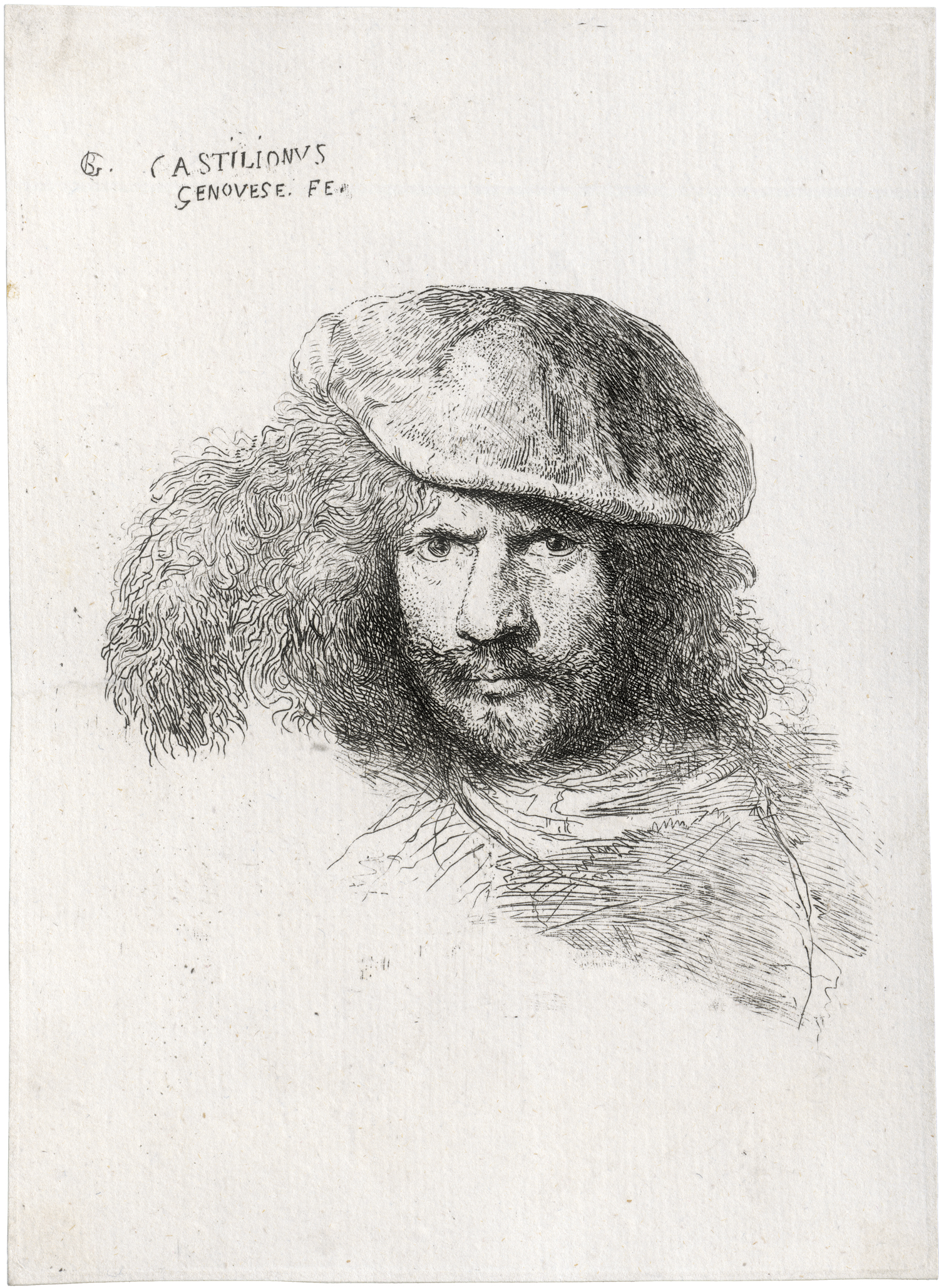 Die Frage nach der Identität des Dargestellten wurde in der Literatur unterschiedlich beantwortet - während Bartsch, Nagler und Le Blanc darin ein Selbstporträt Castigliones sahen, halten Marcenaro und Bellini es für ein Porträt Gian Lorenzo Berninis und datieren es auf das Ende der 1640er Jahre, etwa um die Entstehung der Folge der "Großen Orientalenköpfe". Unverkennbar ist der Einfluss von Rembrandts Selbstbildnissen. - Ganz ausgezeichneter, kräftiger und dabei nuancierter Druck mit feinem Rändchen um die Facette. Minimale Gebrauchsspuren, dünn hinterlegt, verso schwach angeschmutzt, im Gesamteindruck sehr schön.