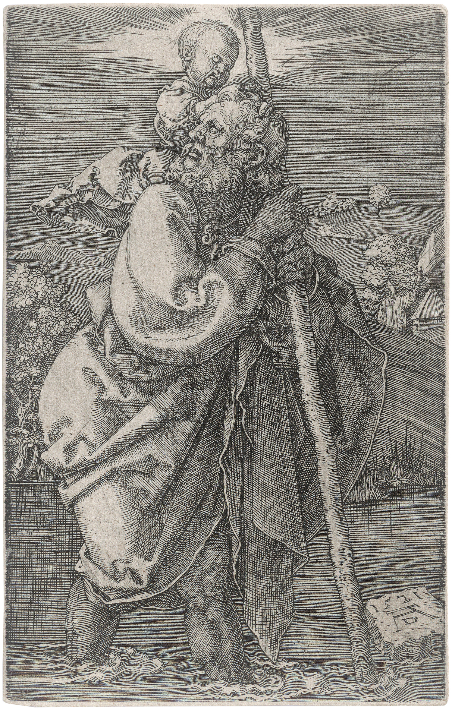 Der hl. Christopherus mit zurückgewandtem Kopfe. Kupferstich. 11,7 x 7,4 cm. 1521. B. 58, Meder 53 wohl c (von d).