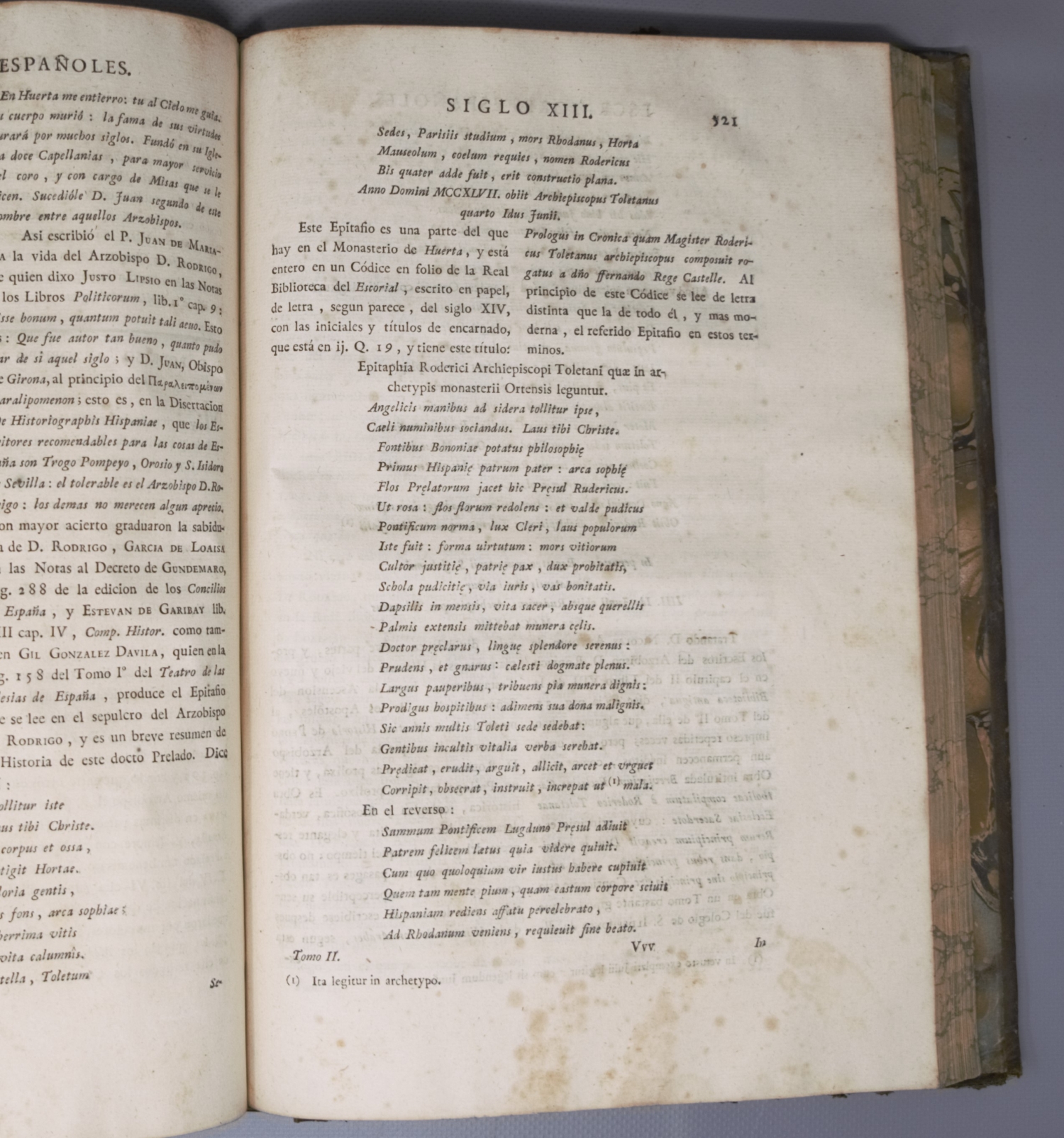 Hoefer IX, 132. – Erste Ausgabe des Werkes zur spanischen Bibliothek mit ausführlich kommentierter Bibliographie von dem Orientalisten, Hebraisten und bedeutenden Bibliothekar José Rodríguez de Castro (1739-1799). Dieser betreute die Bilbiotheken der spanischen Könige Karl III. und Karl IV. und fertigte als sein Hauptwerk das vorliegende Opus Magnum an. De Castro "fue discípulo y colaborador de Miguel Casiri y emprendió la edición de una ambiciosa Biblioteca Española (1781-1786) redactada en castellano y cuyo primer tomo se imprimió significativamente un año antes que la reedición de las Bibliothecas de Nicolás Antonio. La obra pretendía hacer una gran reseña bibliográfica de la producción rabínica española; sin embargo, recibió importantes vapuleos críticos por parte de Tomás Antonio Sánchez y Juan Antonio Pellicer. Murió prematuramente sin haber logrado publicar el tomo tercero." (Wikipedia 22.05.25). – Titel etwas braun-, finger- und feuchtfleckig, insgesamt leicht stockfleckig, vereinzelt feuchtrandig, gewellt und mit Gebrauchsspuren. Mit einem zeitgenössischem Besitzvermerk sowie einem gelöschtem Besitzvermerk auf dem Titel. Rücken leicht abweichend gebunden.