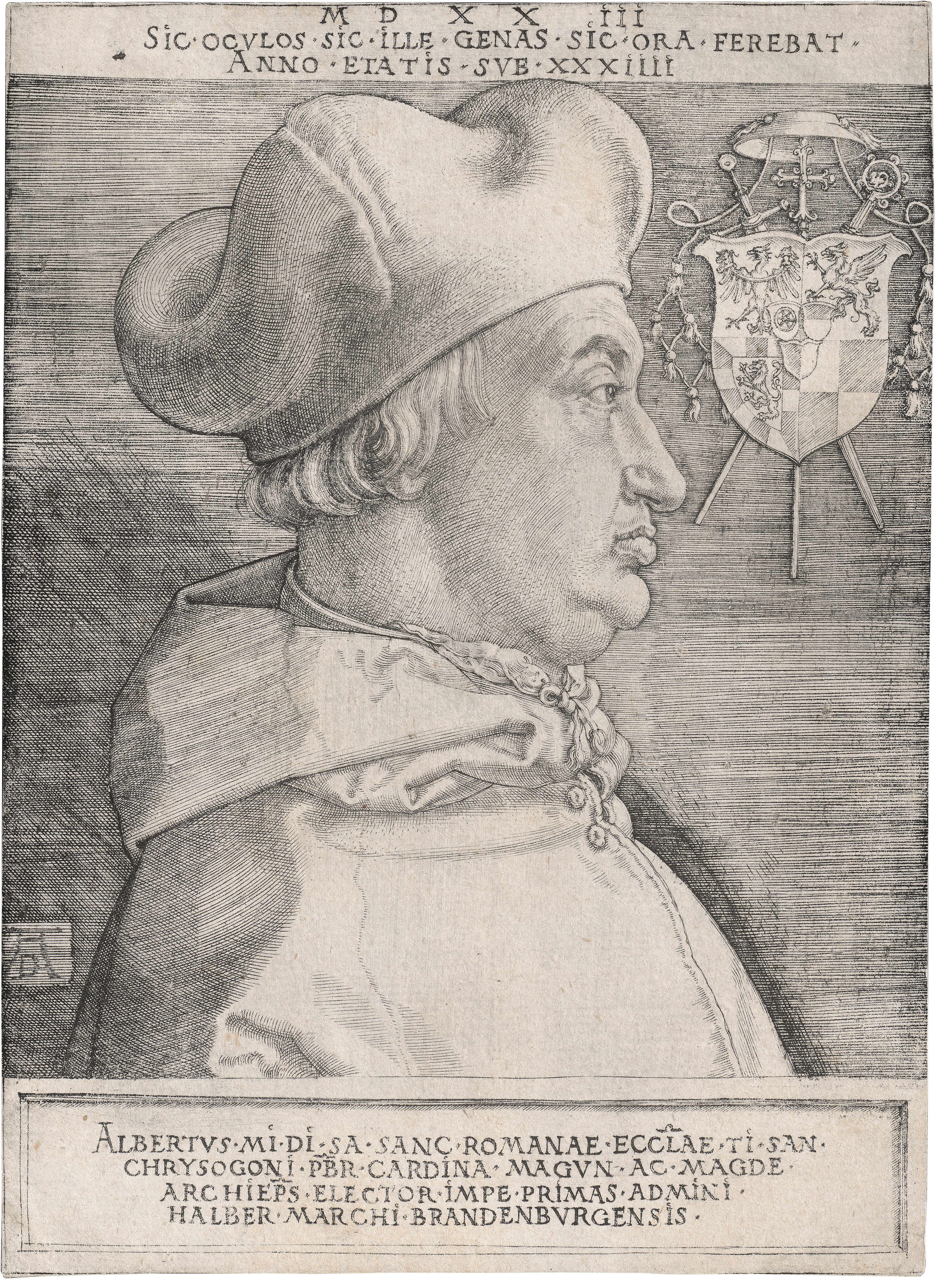 Kardinal Albrecht von Brandenburg, Bischof von Mainz ("Der kleine Kardinal"). Kupferstich. 17,2 x 12,6 cm. 1523. B. 103, Meder 101 II.