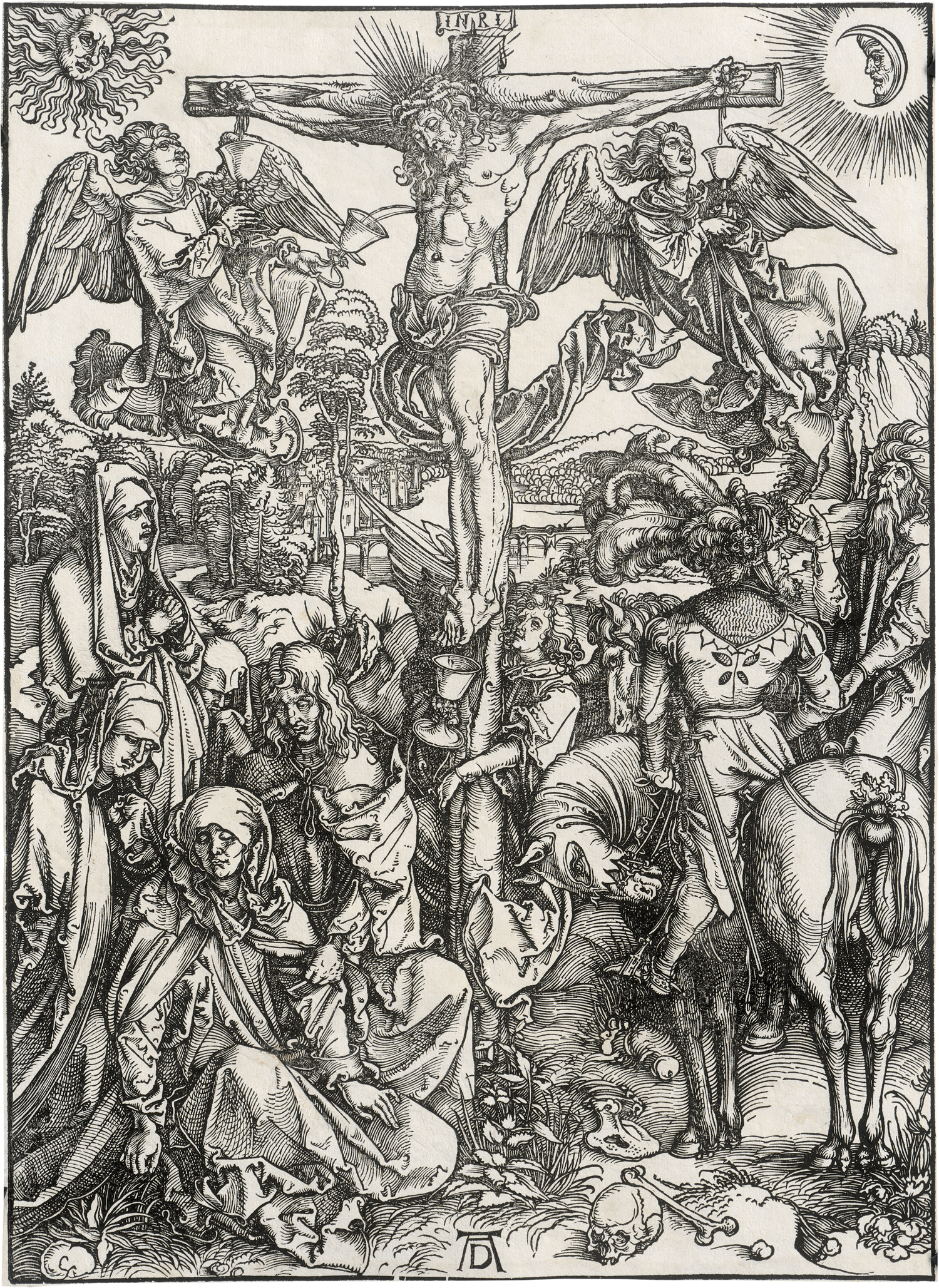 Christus am Kreuz. Holzschnitt. 39,8 x 27,9 cm. Um 1498. B. 11, Meder 120, vor dem Text a (von b). Wz. Ochsenkopf mit Schlangenstab (Meder 81).