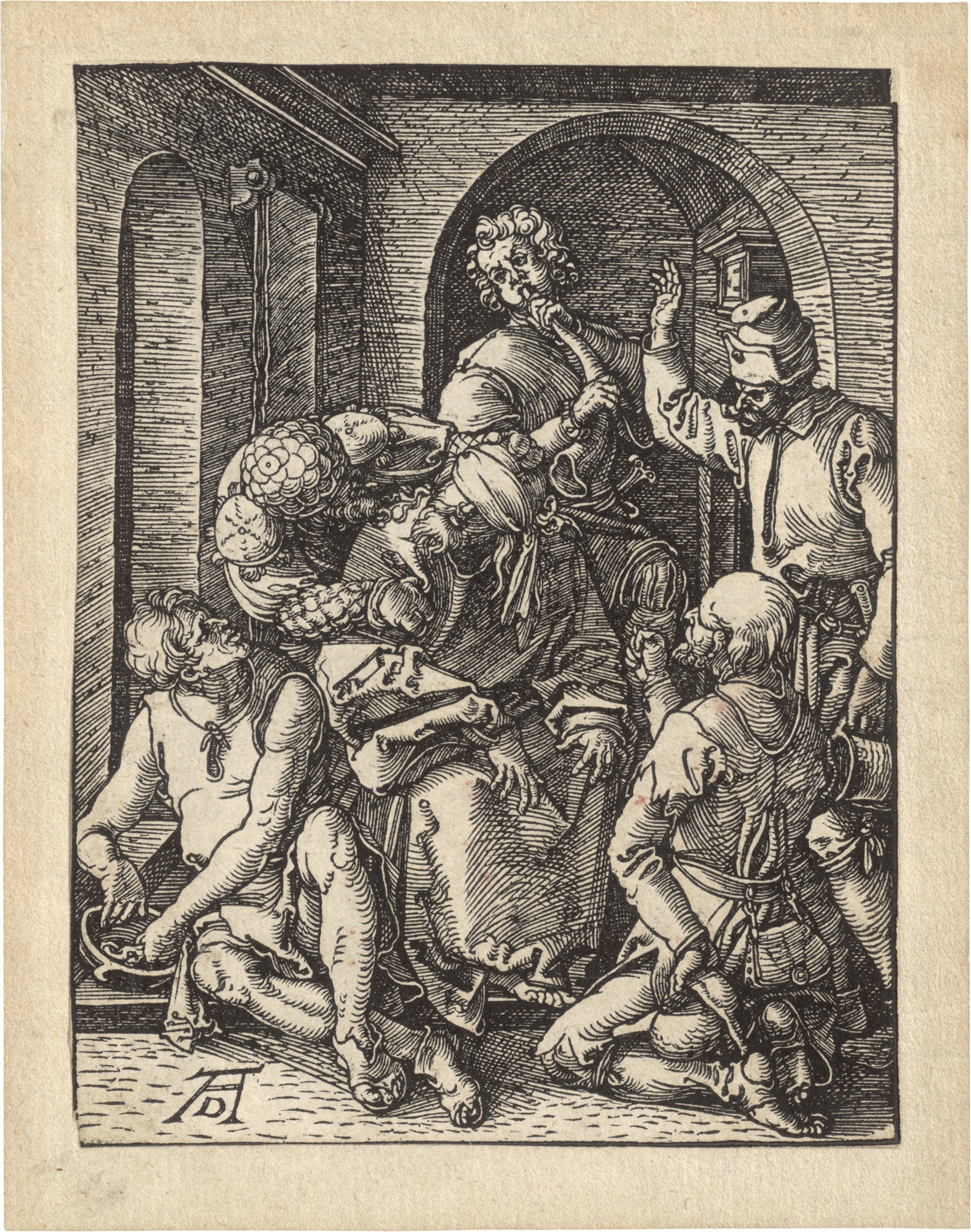 Blatt 15 der Folge. Mit der eingestoßenen Stelle oben links. Ganz ausgezeichneter, kräftiger Druck an die Einfassung geschnitten, links partiell innerhalb dieser. Geringe Gebrauchsspuren, zwei schwache rötliche Fleckchen auf der knienden Figur, dünne Stelle im oberen linken Bereich verso, beriebene Stelle verso mittig, auf ein schmales Fensterpassepartout montiert, minimal angestaubt, sonst sehr gut erhalten.