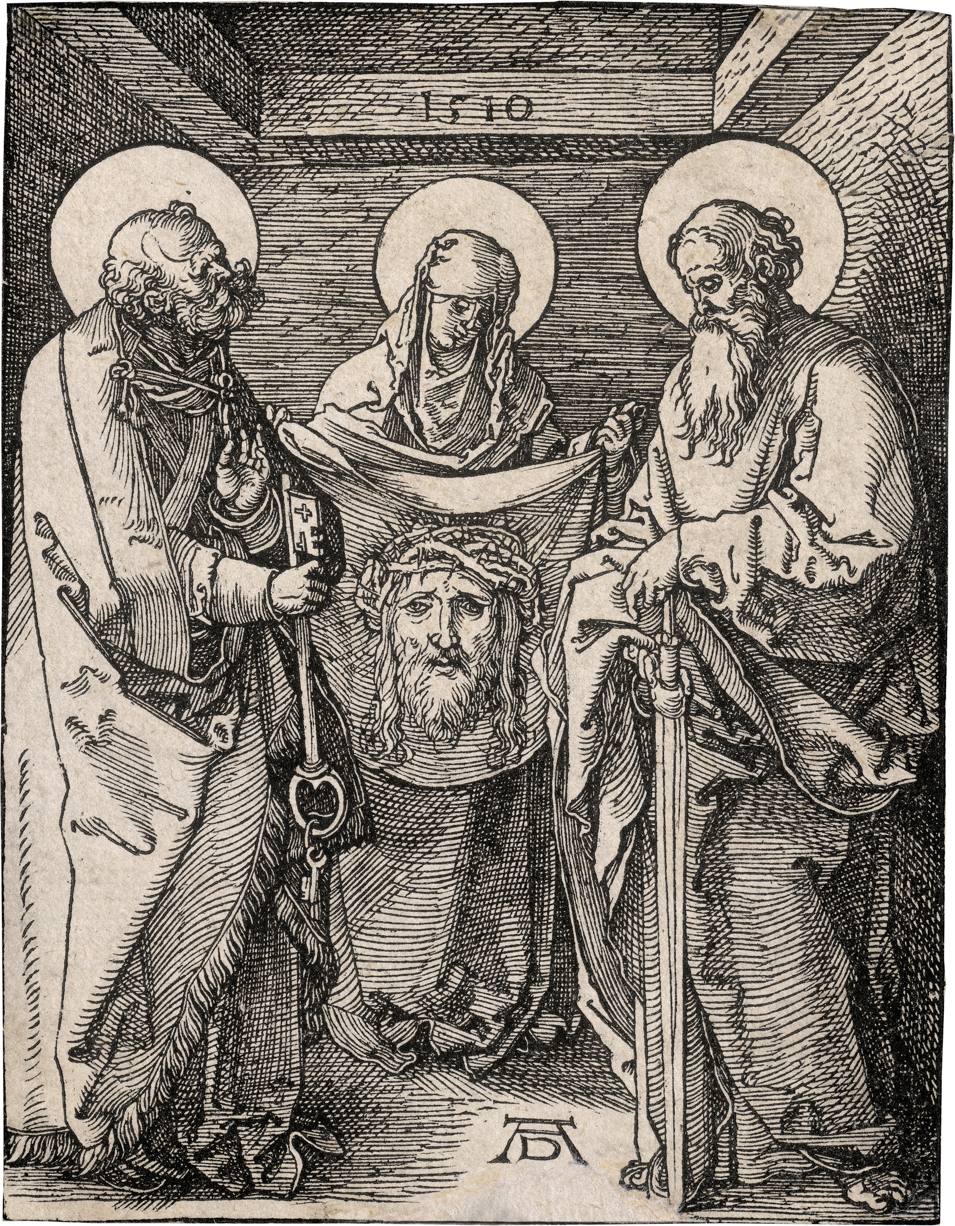 Veronika zwischen St. Peter und Paul. Holzschnitt. 12,7 x 9,7 cm. 1510. B. 38, Meder 147, vor dem Text. Wz. Ochsenkopf mit JZ (Blume, Fragment).
