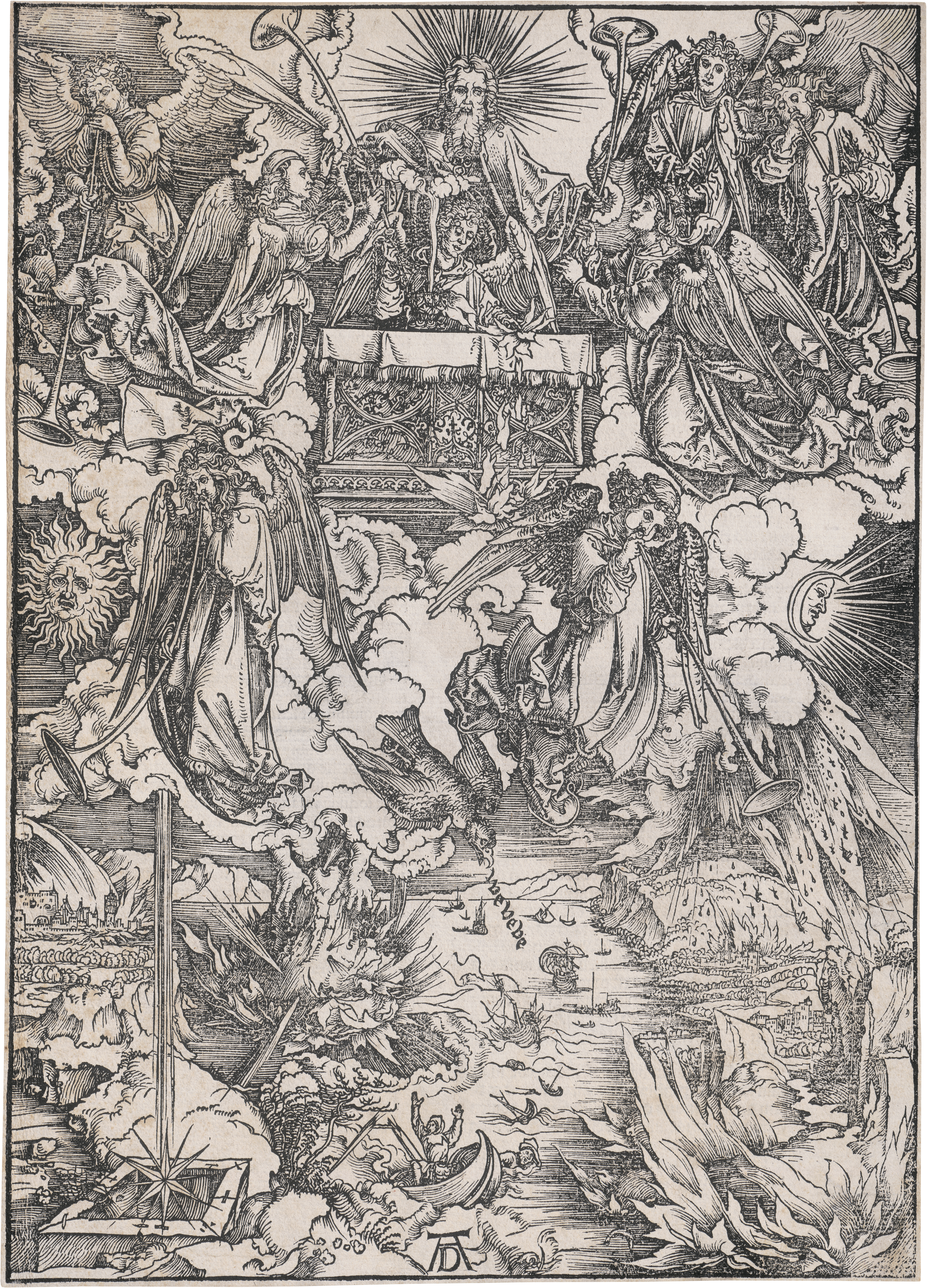 Die sieben Posaunenengel. Holzschnitt. 39 x 27,7 cm. Um 1496-1498. B. 68, Meder 170, lateinische Ausgabe von 1511.