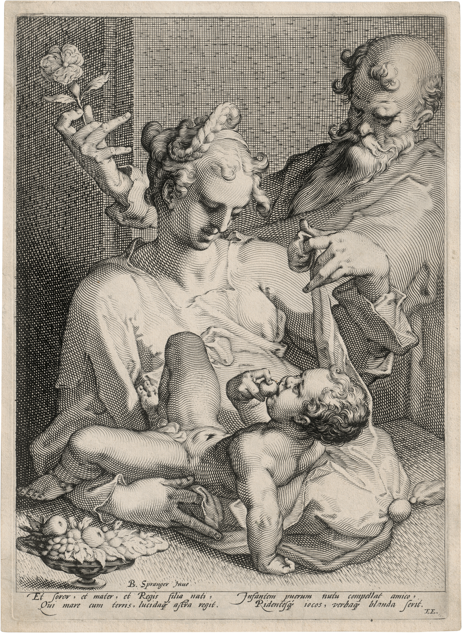 Die hl. Familie mit der Rose. Kupferstich nach Bartholomäus Spranger. 23,5 x 16,7 cm. B. (Goltzius, pièces douteuses) 297, Hollstein (Spranger) 4 I (von II), Hollstein (nach Goltzius) 430, Leesberg (New Hollstein, Goltzius) R4 I (von II), Leesberg (New Hollstein, Jode) 27 I (von II). Wz. Stadttor mit Doppelkopfadler, Nebenmarke Initialen SG (New Hollstein, Muller Dynasty, Bd. II, S. 318, Nr. 1, um 1592-1596).