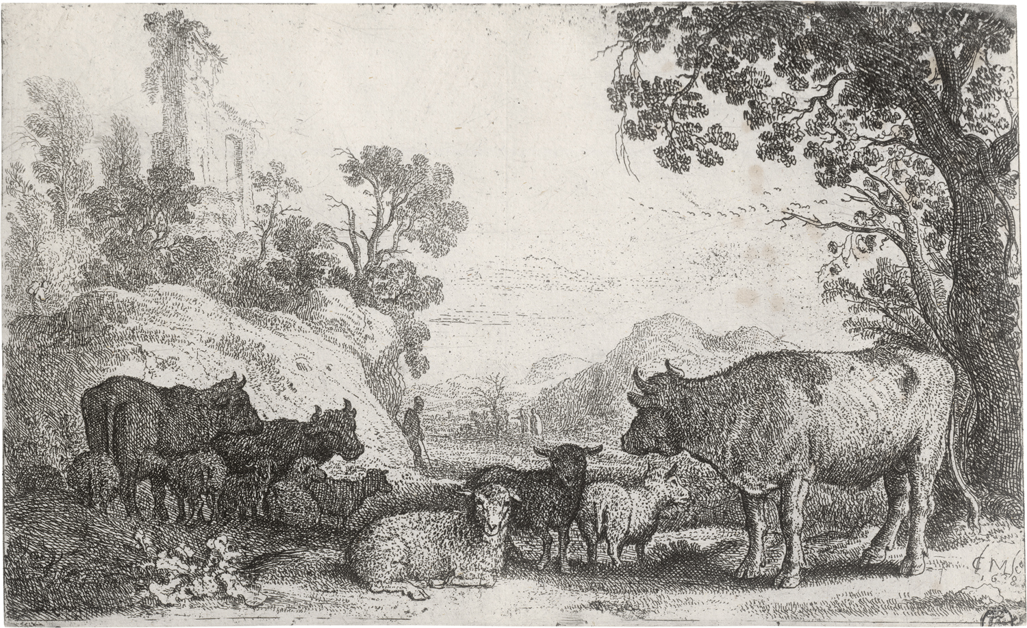Die kleine Herde. Radierung. 11,7 x 19,2 cm. 1638. Van der Kellen 23, Hollstein 23 I (von II). Wz. Siebenzackige Schellenkappe.